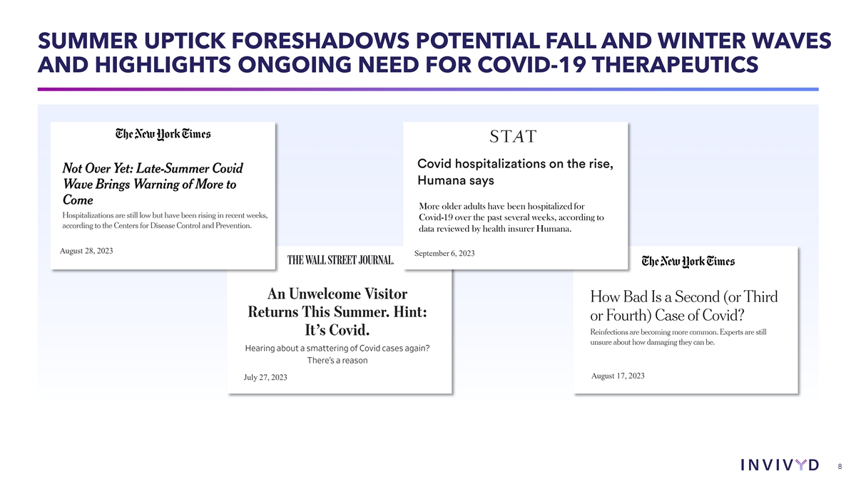 PREVENTION OF COVID-19 IN VULNERABLE POPULATIONS PRESENTS A COMPELLING, POTENTIAL LONG-TERM VALUE PROPOSITION $2.2B in total revenue of Evusheld® in 2022, a mAb previously 1 authorized to protect vulnerable populations from COVID-19 $1,400 $1,270M $1,200 In a 2023 survey of U.S. physicians $1,000 $914M who treat immunocompromised people, 76% said they would be $800 ‘extremely likely’ or ‘somewhat likely’ to use Evusheld® if it were $600 still available and relevant to 2 circulating SARS-CoV-2 strains $400 $200 $135M $0 H2 2021 H1 2022 H2 2022 References: 1. Results publicly reported by AstraZeneca; 2. Invivyd-sponsored survey of HCPs in the U.S. (N=197) (2023) 7 TOTAL REVENUE (MILLIONS)