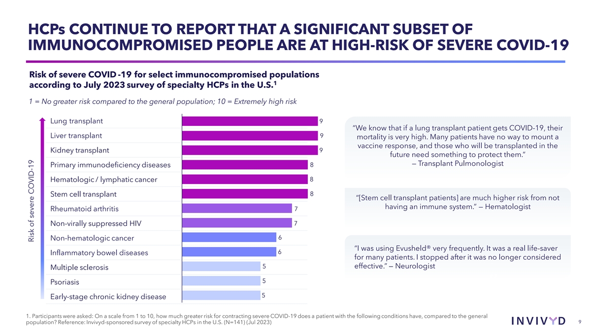 HCPs CONTINUE TO REPORT THAT A SIGNIFICANT SUBSET OF IMMUNOCOMPROMISED PEOPLE ARE AT HIGH-RISK OF SEVERE COVID-19 Risk of severe COVID -19 for select immunocompromised populations 1 according to July 2023 survey of specialty HCPs in the U.S. 1 = No greater risk compared to the general population; 10 = Extremely high risk Lung transplant 9 “We know that if a lung transplant patient gets COVID-19, their 9 Liver transplant mortality is very high. Many patients have no way to mount a vaccine response, and those who will be transplanted in the Kidney transplant 9 future need something to protect them.” — Transplant Pulmonologist Primary immunodeficiency diseases 8 8 Hematologic / lymphatic cancer 8 Stem cell transplant “[Stem cell transplant patients] are much higher risk from not having an immune system.” — Hematologist 7 Rheumatoid arthritis 7 Non-virally suppressed HIV 6 Non-hematologic cancer “I was using Evusheld® very frequently. It was a real life-saver 6 Inflammatory bowel diseases for many patients. I stopped after it was no longer considered 5 effective.” — Neurologist Multiple sclerosis 5 Psoriasis ” 5 Early-stage chronic kidney disease 1. Participants were asked: On a scale from 1 to 10, how much greater risk for contracting severe COVID-19 does a patient with the following conditions have, compared to the general population? Reference: Invivyd-sponsored survey of specialty HCPs in the U.S. (N=141) (Jul 2023) 9 Risk of severe COVID-19