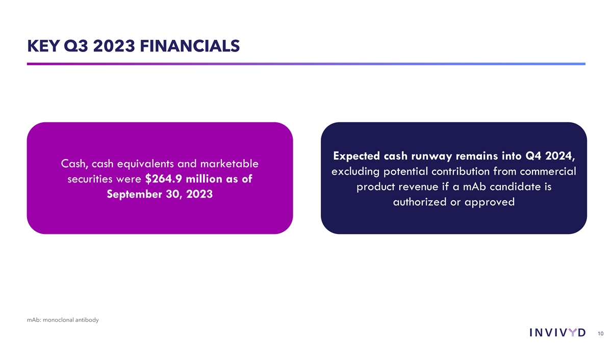 KEY Q3 2023 FINANCIALS Expected cash runway remains into Q4 2024, Cash, cash equivalents and marketable excluding potential contribution from commercial securities were $264.9 million as of product revenue if a mAb candidate is September 30, 2023 authorized or approved mAb: monoclonal antibody 10