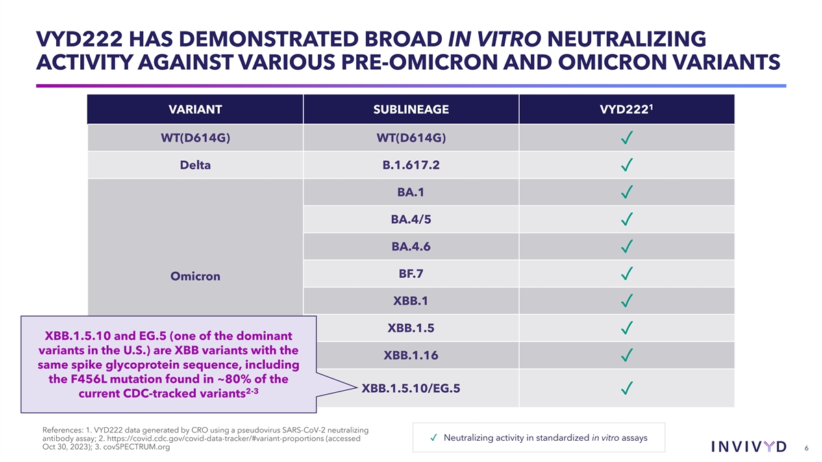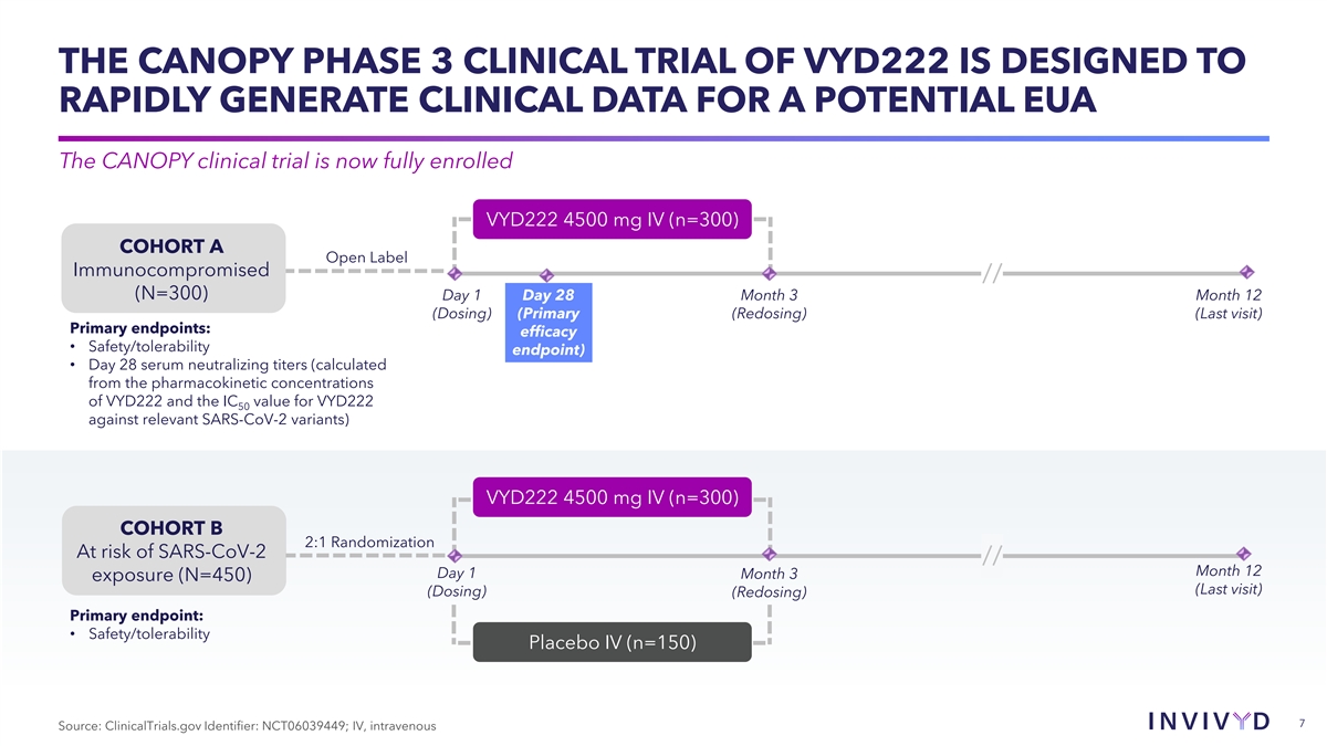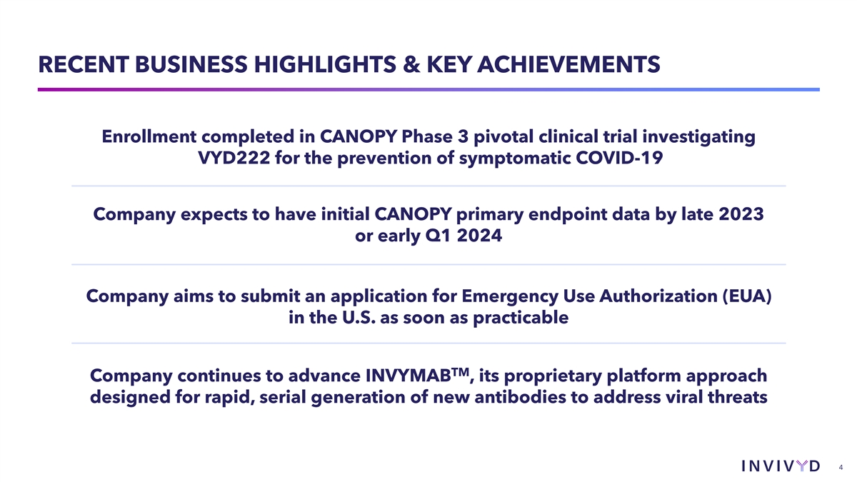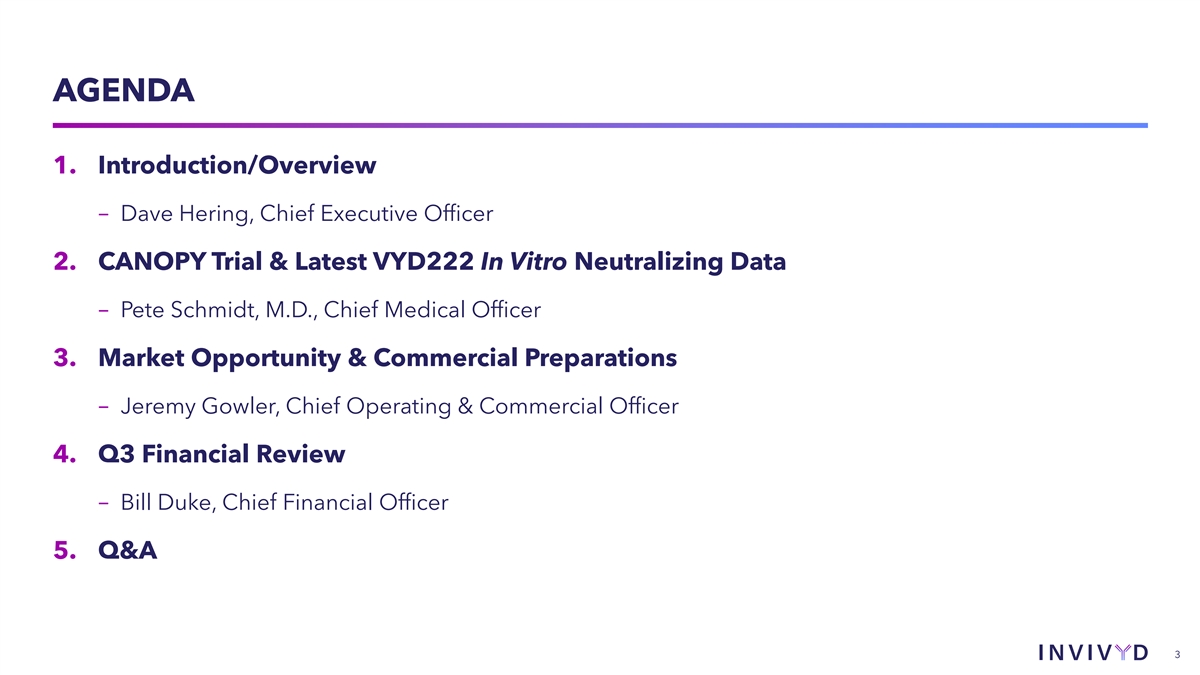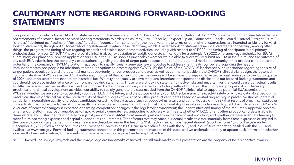 CAUTIONARY NOTE REGARDING FORWARD-LOOKING STATEMENTS This presentation contains forward-looking statements within the meaning of the U.S. Private Securities Litigation Reform Act of 1995. Statements in this presentation that are not statements of historical fact are forward-looking statements. Words such as “may,” “will,” “should,” “expect,” “plan,” “anticipate,” “seek,” “could,” “intend,” “target,” “aim,” “project,” “designed to,” “estimate,” “believe,” “predict,” “potential” or “continue” or the negative of these terms or other similar expressions are intended to identify forward- looking statements, though not all forward-looking statements contain these identifying words. Forward-looking statements include statements concerning, among other things, the progress and timing of our ongoing research and clinical development activities, including with respect to VYD222; the timing of anticipated initial primary endpoint data from our CANOPY Phase 3 pivotal clinical trial; our expectation to rapidly generate clinical data for a potential VYD222 emergency use authorization (EUA) submission; our plans to submit an application for EUA in the U.S. as soon as practicable; whether we are able to successfully submit an EUA in the future, and the outcome of any such EUA submission; the company’s expectations regarding the size of target patient populations and the potential market opportunity for its product candidates; the potential of the company’s INVYMAB platform approach to rapidly, serially generate new antibodies to address viral threats; our beliefs regarding the need of immunocompromised people for additional therapeutic options to protect against COVID-19; the future of the COVID-19 landscape; our expectations regarding the size of target patient populations and the potential market opportunity for our product candidates, as well as our market position; the CANOPY clinical trial design; the potential commercialization of VYD222 in the U.S., if authorized; our belief that our existing cash resources will be sufficient to support an expected cash runway into the fourth quarter of 2024; and other statements that are not historical fact. We may not actually achieve the plans, intentions or expectations disclosed in our forward-looking statements and you should not place undue reliance on our forward-looking statements. These forward-looking statements involve risks and uncertainties that could cause our actual results to differ materially from the results described in or implied by the forward-looking statements, including, without limitation: the timing and progress of our discovery, preclinical and clinical development activities; our ability to rapidly generate the data needed from the CANOPY clinical trial to support a potential EUA submission for VYD222; whether we are able to successfully submit an EUA in the future, and the outcome of any such EUA submission; unexpected safety or efficacy data observed during preclinical studies or clinical trials; the predictability of clinical success of VYD222 or other product candidates based on neutralizing activity in preclinical studies; potential variability in neutralizing activity of product candidates tested in different assays, such as pseudovirus assays and authentic assays; the risk that results of preclinical studies or clinical trials may not be predictive of future results in connection with current or future clinical trials; variability of results in models used to predict activity against SARS-CoV- 2 variants of concern; changes in expected or existing competition; changes in the regulatory environment; the uncertainties and timing of the regulatory approval process; whether our platform approach enables us to rapidly, serially generate new antibodies to address viral threats; whether VYD222 or any other product candidate is able to demonstrate and sustain neutralizing activity against predominant SARS-CoV-2 variants, particularly in the face of viral evolution; and whether we have adequate funding to meet future operating expenses and capital expenditure requirements. Other factors that may cause our actual results to differ materially from those expressed or implied in the forward-looking statements in this presentation are described under the heading “Risk Factors” in our most recent Annual Report on Form 10-K for the year ended December 31, 2022 filed with the Securities and Exchange Commission (SEC), and in our other filings with the SEC, and in our future reports to be filed with the SEC and available at www.sec.gov. Forward-looking statements contained in this presentation are made as of this date, and we undertake no duty to update such information whether as a result of new information, future events or otherwise, except as required under applicable law. © 2023 Invivyd, Inc. Invivyd, Invymab and the Invivyd logo are trademarks of Invivyd, Inc. All trademarks in this presentation are the property of their respective owners. 2