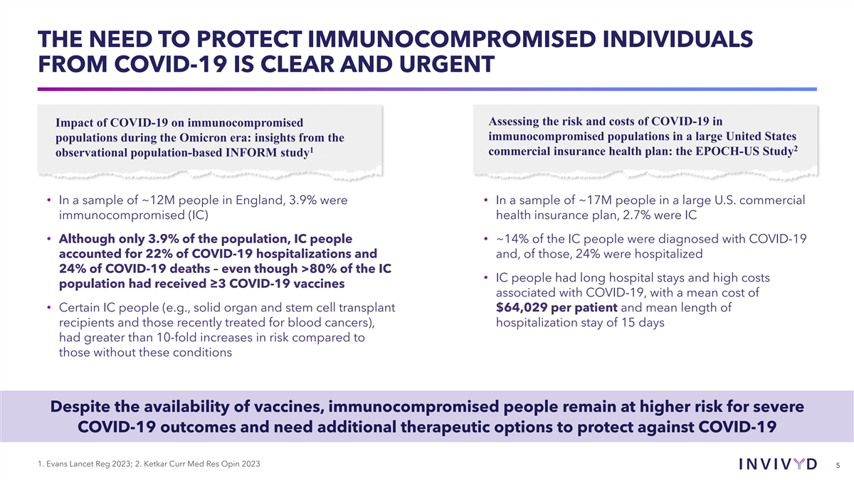 THE NEED TO PROTECT IMMUNOCOMPROMISED INDIVIDUALS FROM COVID-19 IS CLEAR AND URGENT Assessing the risk and costs of COVID-19 in Impact of COVID-19 on immunocompromised immunocompromised populations in a large United States populations during the Omicron era: insights from the 2 1 commercial insurance health plan: the EPOCH-US Study observational population-based INFORM study • In a sample of ~12M people in England, 3.9% were • In a sample of ~17M people in a large U.S. commercial immunocompromised (IC) health insurance plan, 2.7% were IC • Although only 3.9% of the population, IC people • ~14% of the IC people were diagnosed with COVID-19 accounted for 22% of COVID-19 hospitalizations and and, of those, 24% were hospitalized 24% of COVID-19 deaths – even though >80% of the IC • IC people had long hospital stays and high costs population had received ≥3 COVID-19 vaccines associated with COVID-19, with a mean cost of • Certain IC people (e.g., solid organ and stem cell transplant $64,029 per patient and mean length of recipients and those recently treated for blood cancers), hospitalization stay of 15 days had greater than 10-fold increases in risk compared to those without these conditions Despite the availability of vaccines, immunocompromised people remain at higher risk for severe COVID-19 outcomes and need additional therapeutic options to protect against COVID-19 1. Evans Lancet Reg 2023; 2. Ketkar Curr Med Res Opin 2023 5