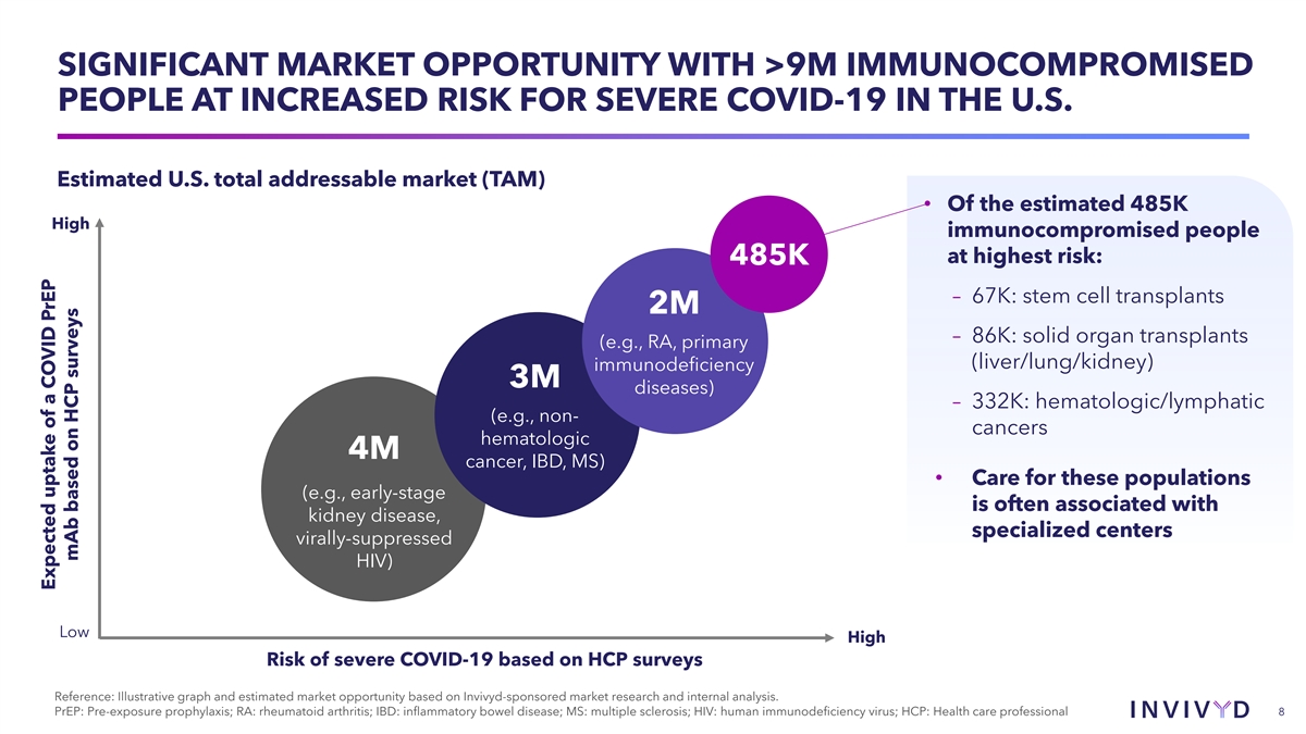 THE CANOPY PHASE 3 CLINICAL TRIAL OF VYD222 IS DESIGNED TO RAPIDLY GENERATE CLINICAL DATA FOR A POTENTIAL EUA The CANOPY clinical trial is now fully enrolled VYD222 4500 mg IV (n=300) COHORT A Open Label Immunocompromised // (N=300) Day 1 Day 28 Month 3 Month 12 (Dosing) (Primary (Redosing) (Last visit) Primary endpoints: efficacy • Safety/tolerability endpoint) • Day 28 serum neutralizing titers (calculated from the pharmacokinetic concentrations of VYD222 and the IC value for VYD222 50 against relevant SARS-CoV-2 variants) VYD222 4500 mg IV (n=300) COHORT B 2:1 Randomization At risk of SARS-CoV-2 // Month 12 Day 1 Month 3 exposure (N=450) (Last visit) (Dosing) (Redosing) Primary endpoint: • Safety/tolerability Placebo IV (n=150) 7 Source: ClinicalTrials.gov Identifier: NCT06039449; IV, intravenous