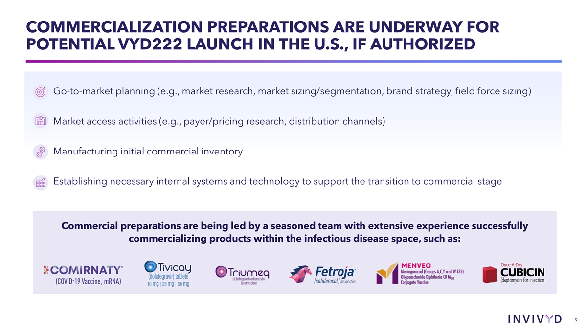 COMMERCIALIZATION PREPARATIONS ARE UNDERWAY FOR POTENTIAL VYD222 LAUNCH IN THE U.S., IF AUTHORIZED Go-to-market planning (e.g., market research, market sizing/segmentation, brand strategy, field force sizing) Market access activities (e.g., payer/pricing research, distribution channels) Manufacturing initial commercial inventory Establishing necessary internal systems and technology to support the transition to commercial stage Commercial preparations are being led by a seasoned team with extensive experience successfully commercializing products within the infectious disease space, such as: 9
