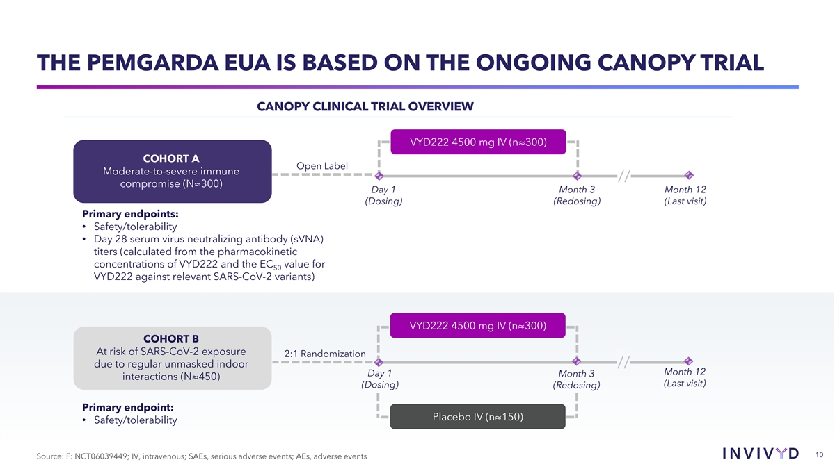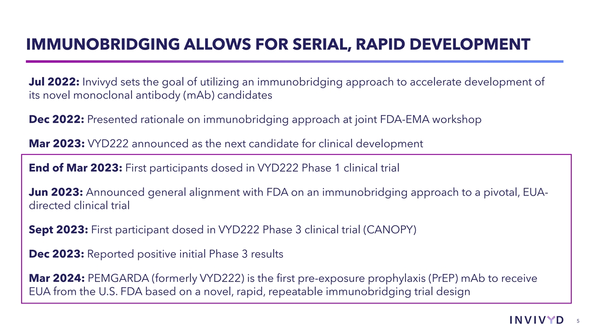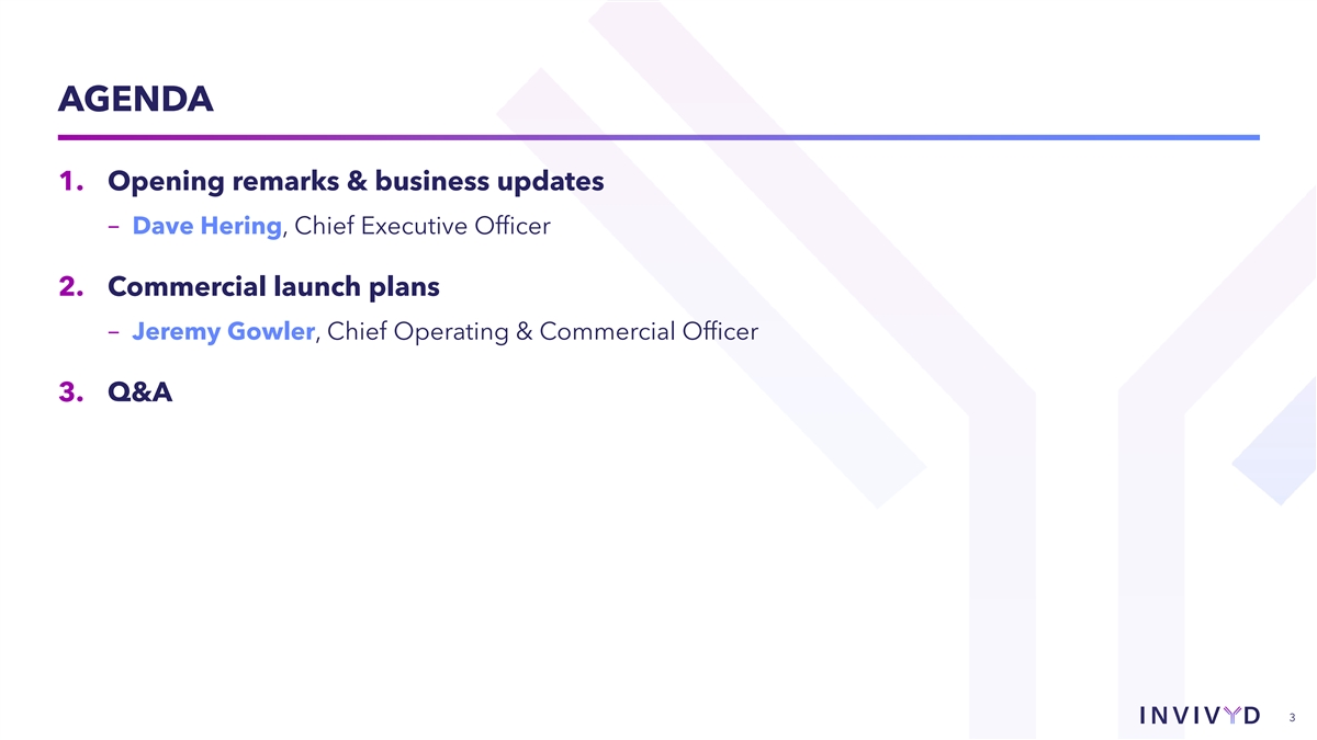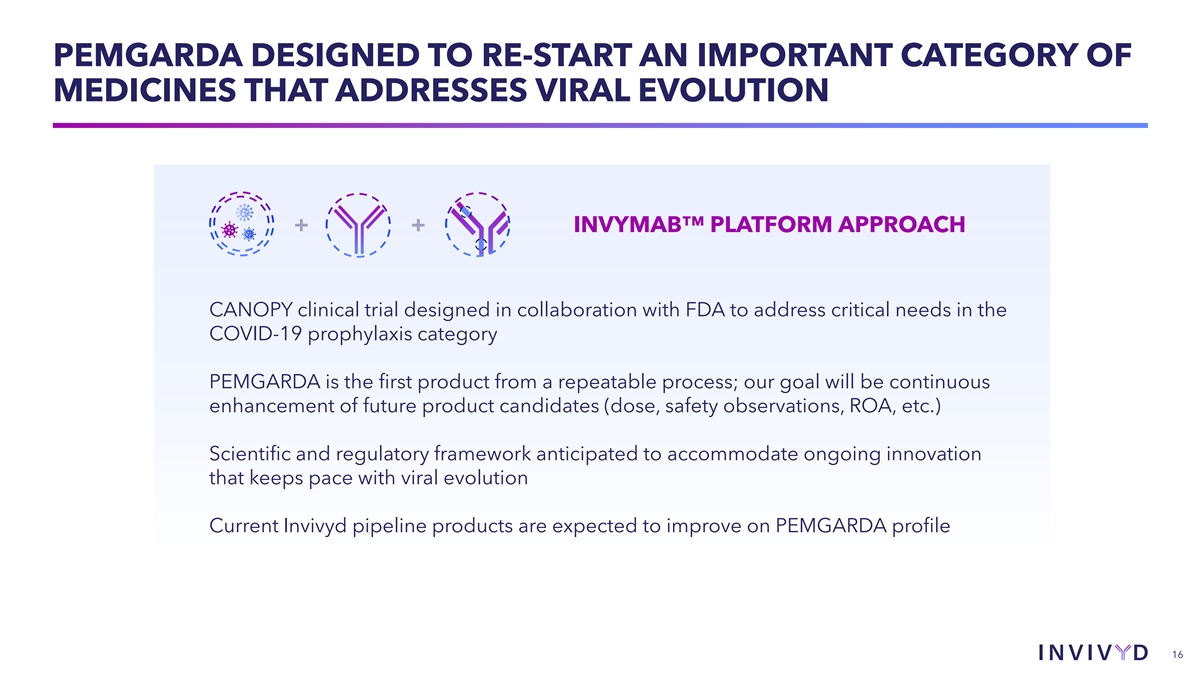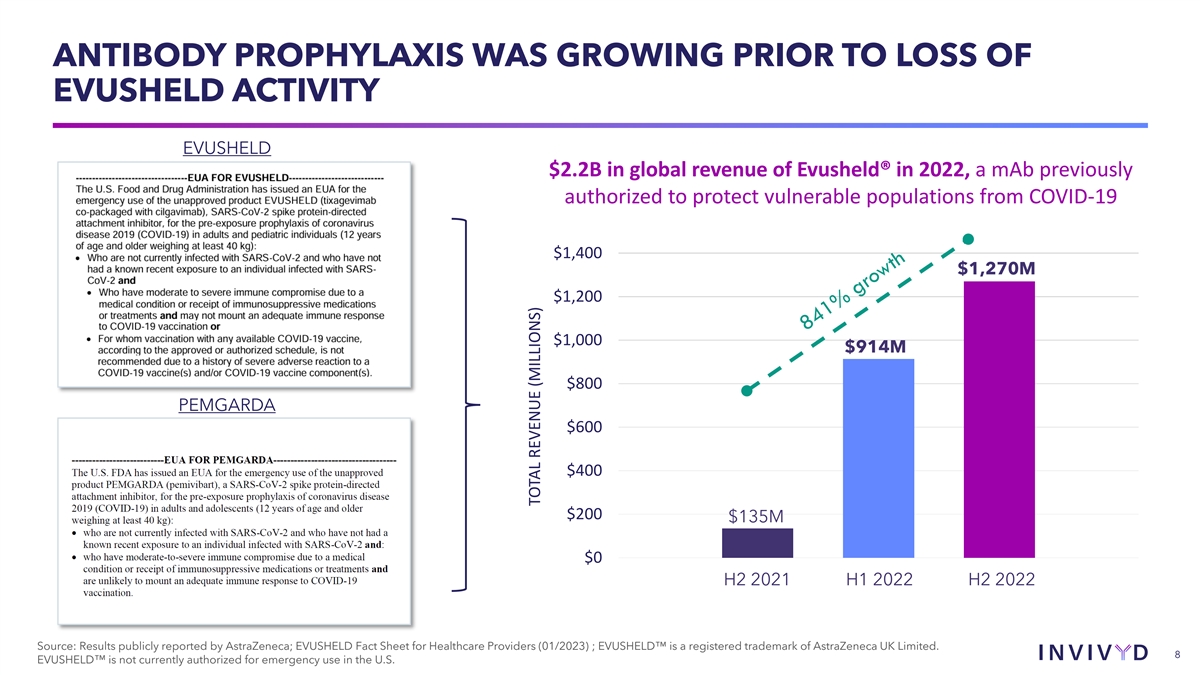 CAUTIONARY NOTE REGARDING FORWARD-LOOKING STATEMENTS This presentation contains forward-looking statements within the meaning of the U.S. Private Securities Litigation Reform Act of 1995. Statements in this presentation that are not statements of historical fact are forward-looking statements. Words such as “may,” “will,” “should,” “expect,” “plan,” “anticipate,” “seek,” “could,” “intend,” “target,” “aim,” “project,” “designed to,” “estimate,” “believe,” “predict,” “potential” or “continue” or the negative of these terms or other similar expressions are intended to identify forward- looking statements, though not all forward-looking statements contain these identifying words. Forward-looking statements include statements concerning, among other things, the potential of PEMGARDA as a monoclonal antibody (mAb) for pre-exposure prophylaxis (prevention) of COVID-19 in adults and adolescents with moderate-to-severe immune compromise; our plans related to the launch and commercialization of PEMGARDA, including our expectations regarding availability and supply of PEMGARDA, our sales and marketing strategy, and our ability to secure third-party coverage and reimbursement for PEMGARDA, and the timing thereof; our plans to share launch metrics in coming quarters; our expectations about the size of target patient populations and the potential market opportunity for our product candidates, as well as our market position; the future of the COVID-19 landscape; the progress and timing of our ongoing research and clinical development activities and future plans; the potential repeatability of an immunobridging trial design for mAb candidates, and the potential for immunobridging to allow for serial, rapid development; the potential of our INVYMAB platform approach to enable the rapid, serial generation new mAbs, and our expectation that current Invivyd pipeline products are expected to improve on PEMGARDA profile; the potential for a scientific and regulatory framework designed to accommodate ongoing innovation that keeps pace with viral evolution; our business strategies and objectives, and ability to execute on them; our future prospects; and other statements that are not historical fact. We may not actually achieve the plans, intentions or expectations disclosed in our forward-looking statements and you should not place undue reliance on our forward-looking statements. These forward-looking statements involve risks and uncertainties that could cause our actual results to differ materially from the results described in or implied by the forward-looking statements, including, without limitation: how long the EUA granted by the FDA for PEMGARDA will remain in effect and whether the EUA is revoked or revised by the FDA; our ability to build and maintain sales, marketing and distribution capabilities to successfully commercialize PEMGARDA; whether we are able to provide sufficient commercial supply of PEMGARDA to meet market demand; whether we can timely obtain and maintain third-party coverage and adequate reimbursement for PEMGARDA or any other product candidate; whether PEMGARDA or any other product candidate is able to demonstrate and sustain neutralizing activity against major SARS-CoV-2 variants, particularly in the face of viral evolution; changes in expected or existing competition; the timing and progress of our discovery, preclinical and clinical development activities; our ability to leverage our INVYMAB platform approach to enable the rapid, serial generation of new mAb candidates and improve future product profiles; the uncertainties and timing of the regulatory authorization or approval process, and available development and regulatory pathways for authorization or approval of our product candidates; changes in the regulatory environment; unexpected safety or efficacy data observed during preclinical studies or clinical trials; the ability to maintain a continued acceptable safety, tolerability and efficacy profile of PEMGARDA or any other product candidate following regulatory authorization or approval; whether we are able to successfully submit an EUA for any other product candidate in the future, and the outcome and timing of any such EUA submission; our ability to improve the profile of any future product candidates; the predictability of clinical success of our product candidates based on neutralizing activity in preclinical studies; the risk that results of preclinical studies or clinical trials may not be predictive of future results, and interim data are subject to further analysis; our reliance on third parties with respect to virus assay creation and product candidate testing and with respect to our clinical trials; variability of results in models used to predict activity against SARS-CoV-2 variants; the complexities of manufacturing mAb therapies; our dependence on third parties to manufacture, label, package, store and distribute clinical and commercial supplies of our product candidates; any litigation and other proceedings or government investigations relating to the company; our ability to continue as a going concern; and whether we have adequate funding to meet future operating expenses and capital expenditure requirements. Other factors that may cause our actual results to differ materially from those expressed or implied in the forward-looking statements in this presentation are described under the heading “Risk Factors” in our most recent Annual Report on Form 10-K for the year ended December 31, 2022 filed with the Securities and Exchange Commission (SEC), and in our other filings with the SEC, and in our future reports to be filed with the SEC and available at www.sec.gov. Forward-looking statements contained in this presentation are made as of this date, and we undertake no duty to update such information whether as a result of new information, future events or otherwise, except as required un