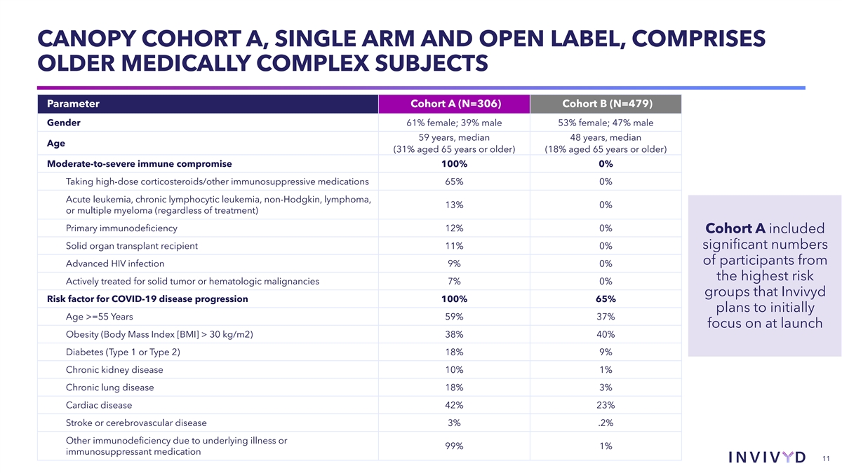 CANOPY COHORT A, SINGLE ARM AND OPEN LABEL, COMPRISES OLDER MEDICALLY COMPLEX SUBJECTS Parameter Cohort A (N=306) Cohort B (N=479) Gender 61% female; 39% male 53% female; 47% male 59 years, median 48 years, median Age (31% aged 65 years or older) (18% aged 65 years or older) Moderate-to-severe immune compromise 100% 0% Taking high-dose corticosteroids/other immunosuppressive medications 65% 0% Acute leukemia, chronic lymphocytic leukemia, non-Hodgkin, lymphoma, 13% 0% or multiple myeloma (regardless of treatment) Primary immunodeficiency 12% 0% Cohort A included Solid organ transplant recipient 11% 0% significant numbers of participants from Advanced HIV infection 9% 0% the highest risk Actively treated for solid tumor or hematologic malignancies 7% 0% groups that Invivyd Risk factor for COVID-19 disease progression 100% 65% plans to initially Age >=55 Years 59% 37% focus on at launch Obesity (Body Mass Index [BMI] > 30 kg/m2) 38% 40% Diabetes (Type 1 or Type 2) 18% 9% Chronic kidney disease 10% 1% Chronic lung disease 18% 3% Cardiac disease 42% 23% Stroke or cerebrovascular disease 3% .2% Other immunodeficiency due to underlying illness or 99% 1% immunosuppressant medication 11