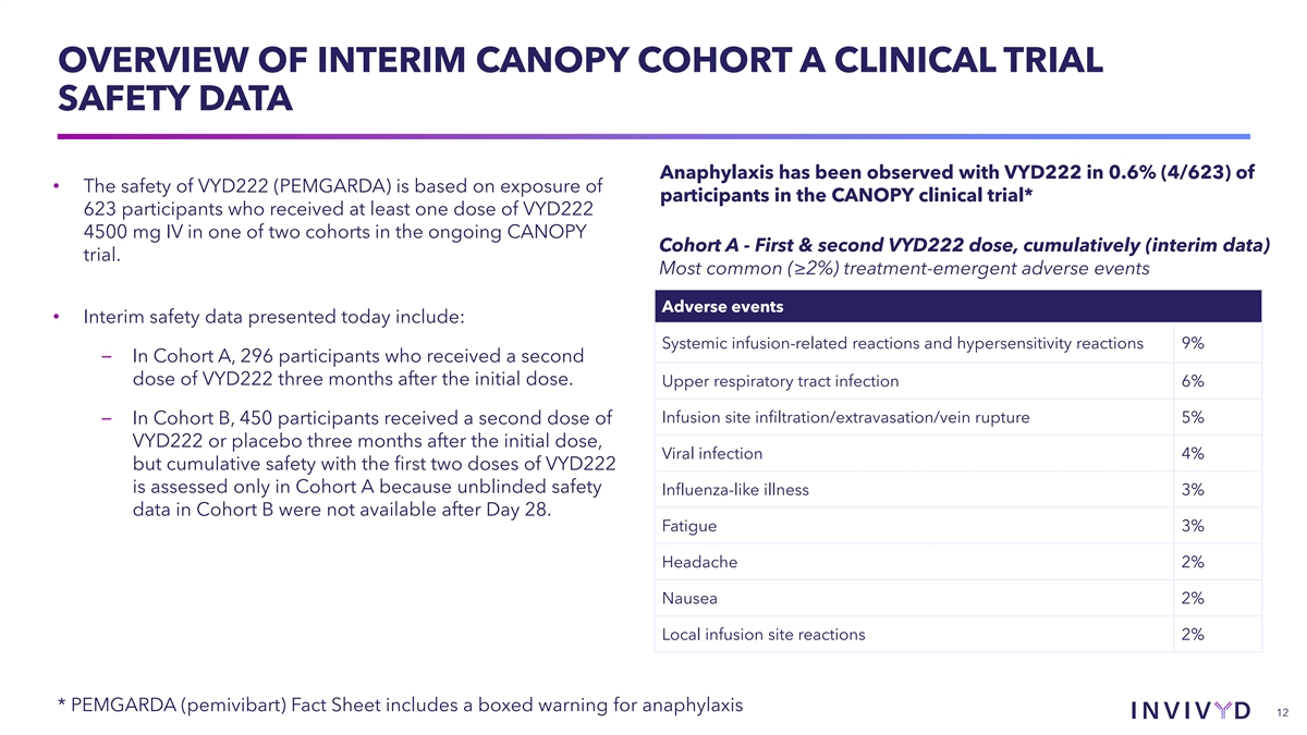 OVERVIEW OF INTERIM CANOPY COHORT A CLINICAL TRIAL SAFETY DATA Anaphylaxis has been observed with VYD222 in 0.6% (4/623) of • The safety of VYD222 (PEMGARDA) is based on exposure of participants in the CANOPY clinical trial* 623 participants who received at least one dose of VYD222 4500 mg IV in one of two cohorts in the ongoing CANOPY Cohort A - First & second VYD222 dose, cumulatively (interim data) trial. Most common (≥2%) treatment-emergent adverse events Adverse events • Interim safety data presented today include: Systemic infusion-related reactions and hypersensitivity reactions 9% – In Cohort A, 296 participants who received a second dose of VYD222 three months after the initial dose. Upper respiratory tract infection 6% Infusion site infiltration/extravasation/vein rupture 5% – In Cohort B, 450 participants received a second dose of VYD222 or placebo three months after the initial dose, Viral infection 4% but cumulative safety with the first two doses of VYD222 is assessed only in Cohort A because unblinded safety Influenza-like illness 3% data in Cohort B were not available after Day 28. Fatigue 3% Headache 2% Nausea 2% Local infusion site reactions 2% * PEMGARDA (pemivibart) Fact Sheet includes a boxed warning for anaphylaxis 12
