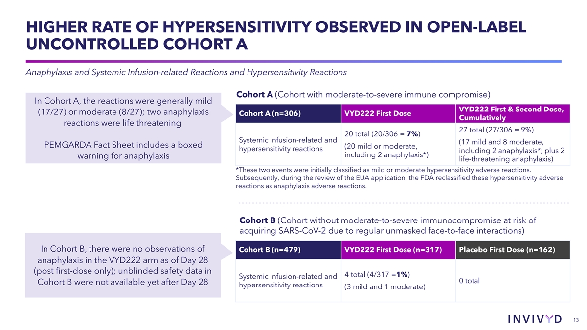 HIGHER RATE OF HYPERSENSITIVITY OBSERVED IN OPEN-LABEL UNCONTROLLED COHORT A Anaphylaxis and Systemic Infusion-related Reactions and Hypersensitivity Reactions Cohort A (Cohort with moderate-to-severe immune compromise) In Cohort A, the reactions were generally mild VYD222 First & Second Dose, (17/27) or moderate (8/27); two anaphylaxis Cohort A (n=306) VYD222 First Dose Cumulatively reactions were life threatening 27 total (27/306 = 9%) 20 total (20/306 = 7%) Systemic infusion-related and (17 mild and 8 moderate, PEMGARDA Fact Sheet includes a boxed (20 mild or moderate, hypersensitivity reactions including 2 anaphylaxis*; plus 2 including 2 anaphylaxis*) warning for anaphylaxis life-threatening anaphylaxis) *These two events were initially classified as mild or moderate hypersensitivity adverse reactions. Subsequently, during the review of the EUA application, the FDA reclassified these hypersensitivity adverse reactions as anaphylaxis adverse reactions. Cohort B (Cohort without moderate-to-severe immunocompromise at risk of acquiring SARS-CoV-2 due to regular unmasked face-to-face interactions) In Cohort B, there were no observations of Cohort B (n=479) VYD222 First Dose (n=317) Placebo First Dose (n=162) anaphylaxis in the VYD222 arm as of Day 28 (post first-dose only); unblinded safety data in 4 total (4/317 =1%) Systemic infusion-related and 0 total Cohort B were not available yet after Day 28 hypersensitivity reactions (3 mild and 1 moderate) 13