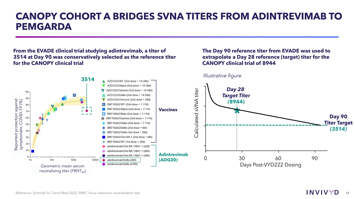 CANOPY COHORT A BRIDGES SVNA TITERS FROM ADINTREVIMAB TO PEMGARDA From the EVADE clinical trial studying adintrevimab, a titer of The Day 90 reference titer from EVADE was used to 3514 at Day 90 was conservatively selected as the reference titer extrapolate a Day 28 reference (target) titer for the for the CANOPY clinical trial CANOPY clinical trial of 8944 Illustrative figure 3514 Day 28 Target Titer (8944) Vaccines * Day 90 Titer Target (3514) Adintrevimab 0 30 60 90 (ADG20) Days Post-VYD222 Dosing Geometric mean serum neutralizing titer (FRNT ) 50 14 Reference: Schmidt Sci Transl Med 2023; FRNT, focus reduction neutralization test Reported protection against symptomatic COVID-19 (%) Calculated sVNA titer