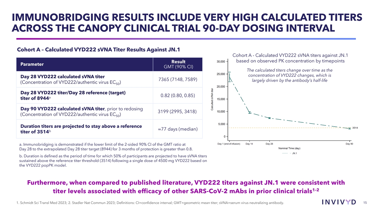 IMMUNOBRIDGING RESULTS INCLUDE VERY HIGH CALCULATED TITERS ACROSS THE CANOPY CLINICAL TRIAL 90-DAY DOSING INTERVAL Cohort A – Calculated VYD222 sVNA Titer Results Against JN.1 Cohort A - Calculated VYD222 sVNA titers against JN.1 based on observed PK concentration by timepoints Result Parameter GMT (90% CI) The calculated titers change over time as the concentration of VYD222 changes, which is Day 28 VYD222 calculated sVNA titer 7365 (7148, 7589) largely driven by the antibody’s half-life (Concentration of VYD222/authentic virus EC ) 50 Day 28 VYD222 titer/Day 28 reference (target) 0.82 (0.80, 0.85) a titer of 8944 Day 90 VYD222 calculated sVNA titer, prior to redosing 3199 (2995, 3418) (Concentration of VYD222/authentic virus EC ) 50 Duration titers are projected to stay above a reference ≈77 days (median) b titer of 3514 a. Immunobridging is demonstrated if the lower limit of the 2-sided 90% CI of the GMT ratio at Day 28 to the extrapolated Day 28 titer target (8944) for 3 months of protection is greater than 0.8. b. Duration is defined as the period of time for which 50% of participants are projected to have sVNA titers sustained above the reference titer threshold (3514) following a single dose of 4500 mg VYD222 based on the VYD222 popPK model. Furthermore, when compared to published literature, VYD222 titers against JN.1 were consistent with 1-2 titer levels associated with efficacy of other SARS-CoV-2 mAbs in prior clinical trials 15 1. Schmidt Sci Transl Med 2023; 2. Stadler Nat Commun 2023; Definitions: CI=confidence interval; GMT=geometric mean titer; sVNA=serum virus neutralizing antibody.