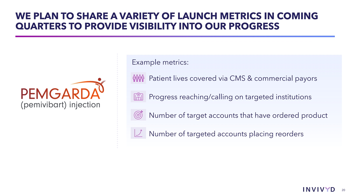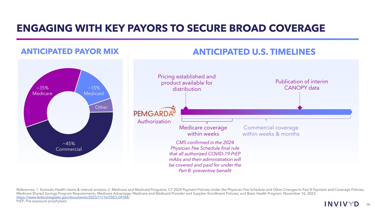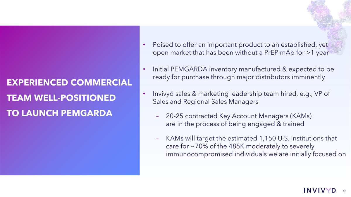 • Poised to offer an important product to an established, yet open market that has been without a PrEP mAb for >1 year • Initial PEMGARDA inventory manufactured & expected to be ready for purchase through major distributors imminently EXPERIENCED COMMERCIAL • Invivyd sales & marketing leadership team hired, e.g., VP of TEAM WELL-POSITIONED Sales and Regional Sales Managers c TO LAUNCH PEMGARDA – 20-25 contracted Key Account Managers (KAMs) are in the process of being engaged & trained – KAMs will target the estimated 1,150 U.S. institutions that care for ~70% of the 485K moderately to severely immunocompromised individuals we are initially focused on 18