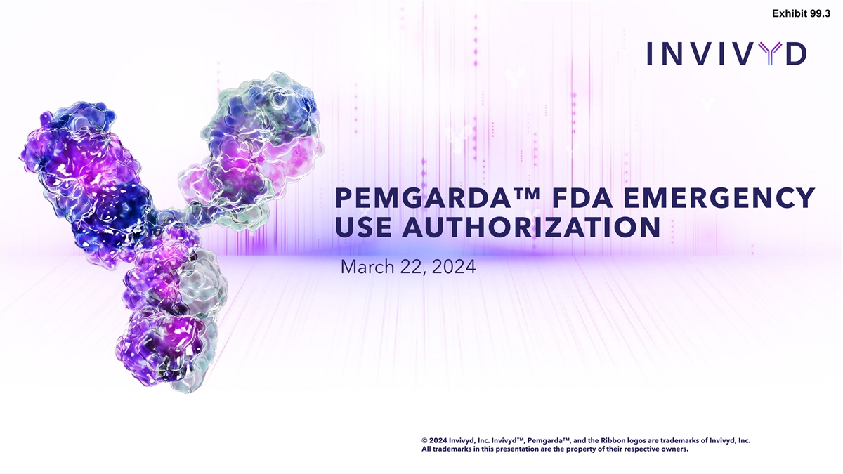 Exhibit 99.3 PEMGARDA FDA EMERGENCY USE AUTHORIZATION March 22, 2024 © 2024 Invivyd, Inc. Invivyd , Pemgarda , and the Ribbon logos are trademarks of Invivyd, Inc. All trademarks in this presentation are the property of their respective owners.