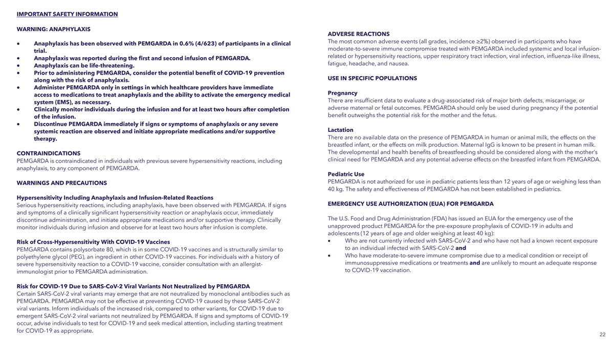 IMPORTANT SAFETY INFORMATION WARNING: ANAPHYLAXIS ADVERSE REACTIONS The most common adverse events (all grades, incidence ≥2%) observed in participants who have • Anaphylaxis has been observed with PEMGARDA in 0.6% (4/623) of participants in a clinical moderate-to-severe immune compromise treated with PEMGARDA included systemic and local infusion- trial. related or hypersensitivity reactions, upper respiratory tract infection, viral infection, influenza-like illness, • Anaphylaxis was reported during the first and second infusion of PEMGARDA. fatigue, headache, and nausea. • Anaphylaxis can be life-threatening. • Prior to administering PEMGARDA, consider the potential benefit of COVID-19 prevention USE IN SPECIFIC POPULATIONS along with the risk of anaphylaxis. • Administer PEMGARDA only in settings in which healthcare providers have immediate Pregnancy access to medications to treat anaphylaxis and the ability to activate the emergency medical There are insufficient data to evaluate a drug-associated risk of major birth defects, miscarriage, or system (EMS), as necessary. adverse maternal or fetal outcomes. PEMGARDA should only be used during pregnancy if the potential • Clinically monitor individuals during the infusion and for at least two hours after completion benefit outweighs the potential risk for the mother and the fetus. of the infusion. • Discontinue PEMGARDA immediately if signs or symptoms of anaphylaxis or any severe Lactation systemic reaction are observed and initiate appropriate medications and/or supportive There are no available data on the presence of PEMGARDA in human or animal milk, the effects on the therapy. breastfed infant, or the effects on milk production. Maternal IgG is known to be present in human milk. The developmental and health benefits of breastfeeding should be considered along with the mother’s CONTRAINDICATIONS clinical need for PEMGARDA and any potential adverse effects on the breastfed infant from PEMGARDA. PEMGARDA is contraindicated in individuals with previous severe hypersensitivity reactions, including anaphylaxis, to any component of PEMGARDA. Pediatric Use PEMGARDA is not authorized for use in pediatric patients less than 12 years of age or weighing less than WARNINGS AND PRECAUTIONS 40 kg. The safety and effectiveness of PEMGARDA has not been established in pediatrics. Hypersensitivity Including Anaphylaxis and Infusion-Related Reactions EMERGENCY USE AUTHORIZATION (EUA) FOR PEMGARDA Serious hypersensitivity reactions, including anaphylaxis, have been observed with PEMGARDA. If signs and symptoms of a clinically significant hypersensitivity reaction or anaphylaxis occur, immediately The U.S. Food and Drug Administration (FDA) has issued an EUA for the emergency use of the discontinue administration, and initiate appropriate medications and/or supportive therapy. Clinically unapproved product PEMGARDA for the pre-exposure prophylaxis of COVID-19 in adults and monitor individuals during infusion and observe for at least two hours after infusion is complete. adolescents (12 years of age and older weighing at least 40 kg): • Who are not currently infected with SARS-CoV-2 and who have not had a known recent exposure Risk of Cross-Hypersensitivity With COVID-19 Vaccines to an individual infected with SARS-CoV-2 and PEMGARDA contains polysorbate 80, which is in some COVID-19 vaccines and is structurally similar to • Who have moderate-to-severe immune compromise due to a medical condition or receipt of polyethylene glycol (PEG), an ingredient in other COVID-19 vaccines. For individuals with a history of immunosuppressive medications or treatments and are unlikely to mount an adequate response severe hypersensitivity reaction to a COVID-19 vaccine, consider consultation with an allergist- to COVID-19 vaccination. immunologist prior to PEMGARDA administration. Risk for COVID-19 Due to SARS-CoV-2 Viral Variants Not Neutralized by PEMGARDA Certain SARS-CoV-2 viral variants may emerge that are not neutralized by monoclonal antibodies such as PEMGARDA. PEMGARDA may not be effective at preventing COVID-19 caused by these SARS-CoV-2 viral variants. Inform individuals of the increased risk, compared to other variants, for COVID-19 due to emergent SARS-CoV-2 viral variants not neutralized by PEMGARDA. If signs and symptoms of COVID-19 occur, advise individuals to test for COVID-19 and seek medical attention, including starting treatment for COVID-19 as appropriate. 22