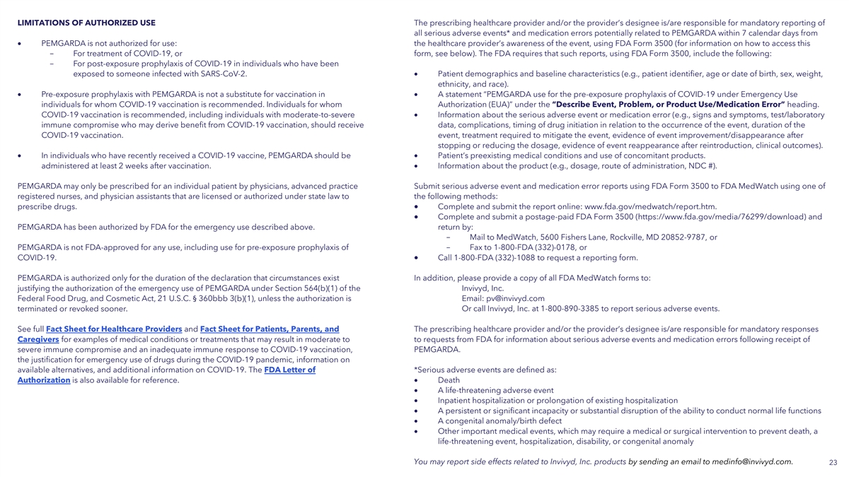 LIMITATIONS OF AUTHORIZED USE The prescribing healthcare provider and/or the provider’s designee is/are responsible for mandatory reporting of all serious adverse events* and medication errors potentially related to PEMGARDA within 7 calendar days from • PEMGARDA is not authorized for use: the healthcare provider’s awareness of the event, using FDA Form 3500 (for information on how to access this - For treatment of COVID-19, or form, see below). The FDA requires that such reports, using FDA Form 3500, include the following: - For post-exposure prophylaxis of COVID-19 in individuals who have been exposed to someone infected with SARS-CoV-2.• Patient demographics and baseline characteristics (e.g., patient identifier, age or date of birth, sex, weight, ethnicity, and race). • Pre-exposure prophylaxis with PEMGARDA is not a substitute for vaccination in • A statement “PEMGARDA use for the pre-exposure prophylaxis of COVID-19 under Emergency Use individuals for whom COVID-19 vaccination is recommended. Individuals for whom Authorization (EUA)” under the “Describe Event, Problem, or Product Use/Medication Error” heading. COVID-19 vaccination is recommended, including individuals with moderate-to-severe • Information about the serious adverse event or medication error (e.g., signs and symptoms, test/laboratory immune compromise who may derive benefit from COVID-19 vaccination, should receive data, complications, timing of drug initiation in relation to the occurrence of the event, duration of the COVID-19 vaccination. event, treatment required to mitigate the event, evidence of event improvement/disappearance after stopping or reducing the dosage, evidence of event reappearance after reintroduction, clinical outcomes). • In individuals who have recently received a COVID-19 vaccine, PEMGARDA should be • Patient’s preexisting medical conditions and use of concomitant products. administered at least 2 weeks after vaccination.• Information about the product (e.g., dosage, route of administration, NDC #). PEMGARDA may only be prescribed for an individual patient by physicians, advanced practice Submit serious adverse event and medication error reports using FDA Form 3500 to FDA MedWatch using one of registered nurses, and physician assistants that are licensed or authorized under state law to the following methods: prescribe drugs.• Complete and submit the report online: www.fda.gov/medwatch/report.htm. • Complete and submit a postage-paid FDA Form 3500 (https://www.fda.gov/media/76299/download) and PEMGARDA has been authorized by FDA for the emergency use described above. return by: - Mail to MedWatch, 5600 Fishers Lane, Rockville, MD 20852-9787, or PEMGARDA is not FDA-approved for any use, including use for pre-exposure prophylaxis of - Fax to 1-800-FDA (332)-0178, or COVID-19.• Call 1-800-FDA (332)-1088 to request a reporting form. PEMGARDA is authorized only for the duration of the declaration that circumstances exist In addition, please provide a copy of all FDA MedWatch forms to: justifying the authorization of the emergency use of PEMGARDA under Section 564(b)(1) of the Invivyd, Inc. Federal Food Drug, and Cosmetic Act, 21 U.S.C. § 360bbb 3(b)(1), unless the authorization is Email: pv@invivyd.com terminated or revoked sooner. Or call Invivyd, Inc. at 1-800-890-3385 to report serious adverse events. See full Fact Sheet for Healthcare Providers and Fact Sheet for Patients, Parents, and The prescribing healthcare provider and/or the provider’s designee is/are responsible for mandatory responses Caregivers for examples of medical conditions or treatments that may result in moderate to to requests from FDA for information about serious adverse events and medication errors following receipt of severe immune compromise and an inadequate immune response to COVID-19 vaccination, PEMGARDA. the justification for emergency use of drugs during the COVID-19 pandemic, information on available alternatives, and additional information on COVID-19. The FDA Letter of *Serious adverse events are defined as: Authorization is also available for reference. • Death • A life-threatening adverse event • Inpatient hospitalization or prolongation of existing hospitalization • A persistent or significant incapacity or substantial disruption of the ability to conduct normal life functions • A congenital anomaly/birth defect • Other important medical events, which may require a medical or surgical intervention to prevent death, a life-threatening event, hospitalization, disability, or congenital anomaly You may report side effects related to Invivyd, Inc. products by sending an email to medinfo@invivyd.com. 23
