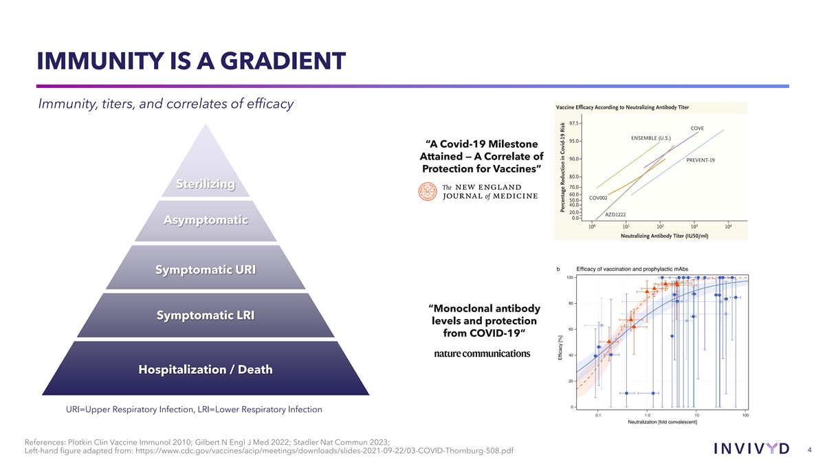 IMMUNITY IS A GRADIENT Immunity, titers, and correlates of efficacy “A Covid-19 Milestone Attained — A Correlate of Protection for Vaccines” Sterilizing Asymptomatic Symptomatic URI “Monoclonal antibody Symptomatic LRI levels and protection from COVID-19” Hospitalization / Death URI=Upper Respiratory Infection, LRI=Lower Respiratory Infection References: Plotkin Clin Vaccine Immunol 2010; Gilbert N Engl J Med 2022; Stadler Nat Commun 2023; 4 Left-hand figure adapted from: https://www.cdc.gov/vaccines/acip/meetings/downloads/slides-2021-09-22/03-COVID-Thornburg-508.pdf