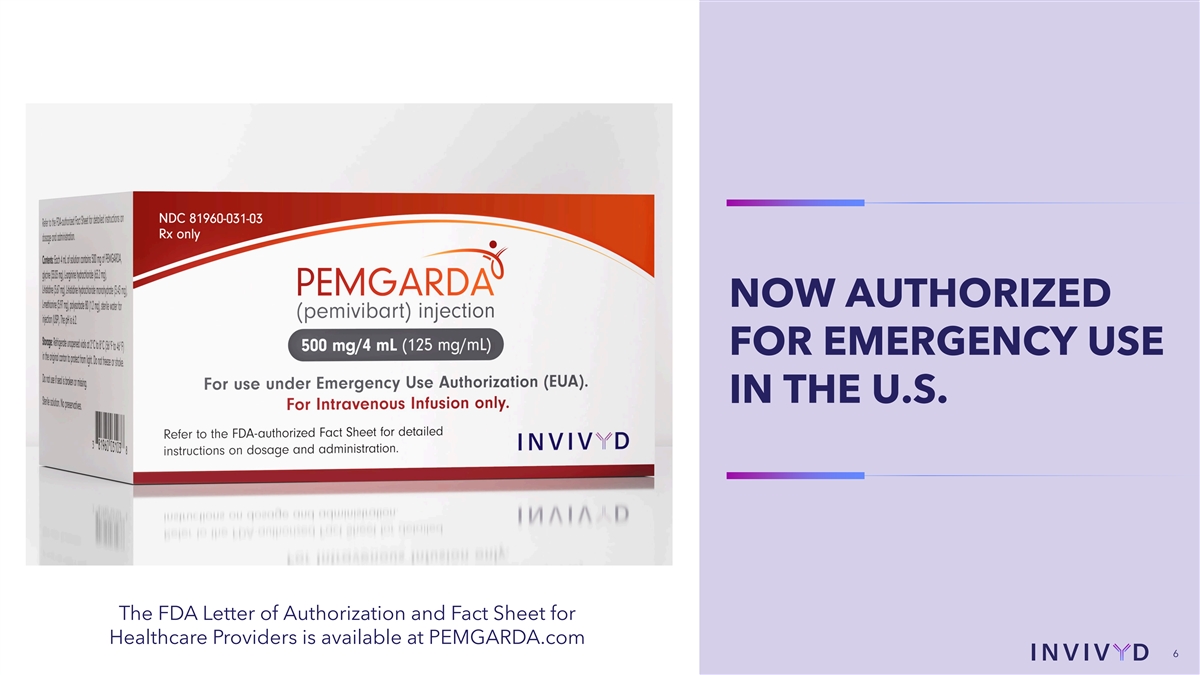 NOW AUTHORIZED FOR EMERGENCY USE IN THE U.S. The FDA Letter of Authorization and Fact Sheet for Healthcare Providers is available at PEMGARDA.com 6 6