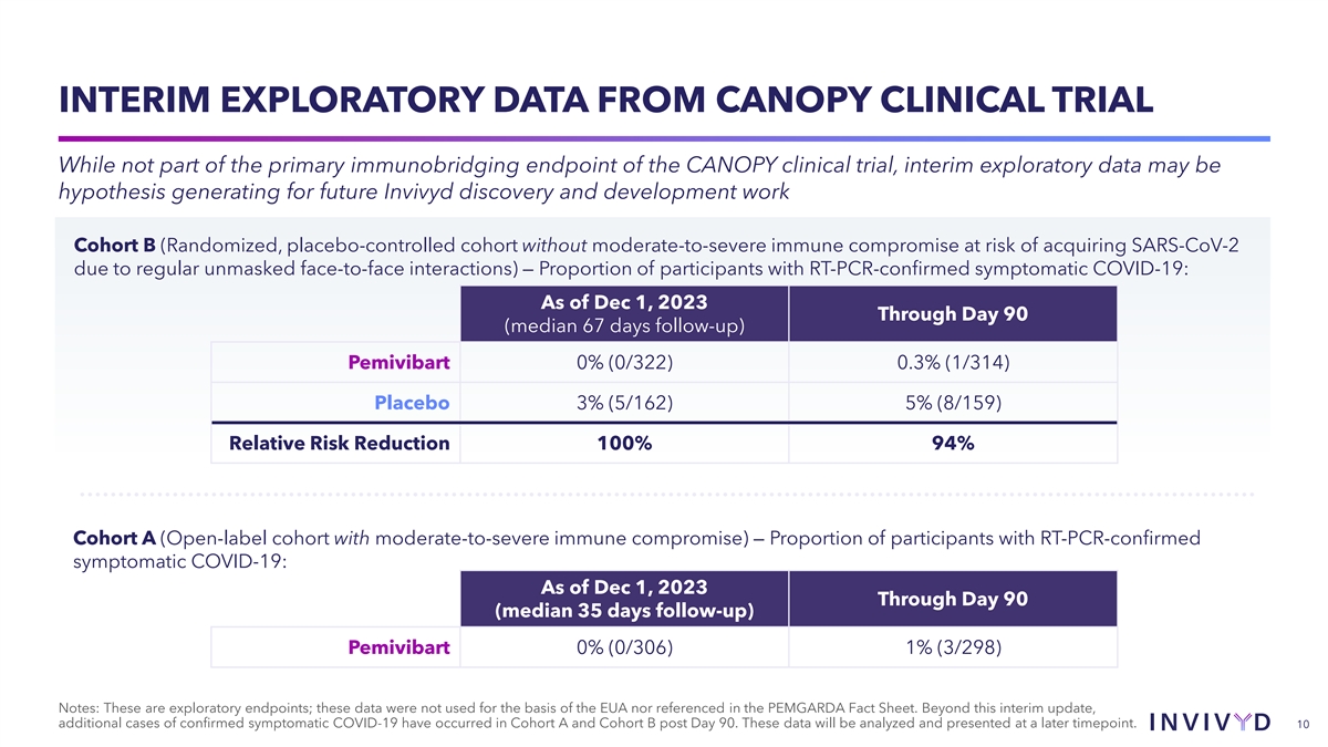 INTERIM EXPLORATORY DATA FROM CANOPY CLINICAL TRIAL While not part of the primary immunobridging endpoint of the CANOPY clinical trial, interim exploratory data may be hypothesis generating for future Invivyd discovery and development work Cohort B (Randomized, placebo-controlled cohort without moderate-to-severe immune compromise at risk of acquiring SARS-CoV-2 due to regular unmasked face-to-face interactions) — Proportion of participants with RT-PCR-confirmed symptomatic COVID-19: As of Dec 1, 2023 Through Day 90 (median 67 days follow-up) Pemivibart 0% (0/322) 0.3% (1/314) Placebo 3% (5/162) 5% (8/159) Relative Risk Reduction 100% 94% Cohort A (Open-label cohort with moderate-to-severe immune compromise) — Proportion of participants with RT-PCR-confirmed symptomatic COVID-19: As of Dec 1, 2023 Through Day 90 (median 35 days follow-up) Pemivibart 0% (0/306) 1% (3/298) Notes: These are exploratory endpoints; these data were not used for the basis of the EUA nor referenced in the PEMGARDA Fact Sheet. Beyond this interim update, additional cases of confirmed symptomatic COVID-19 have occurred in Cohort A and Cohort B post Day 90. These data will be analyzed and presented at a later timepoint. 10