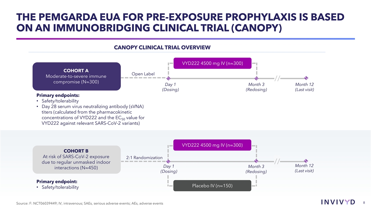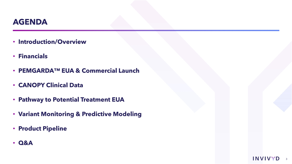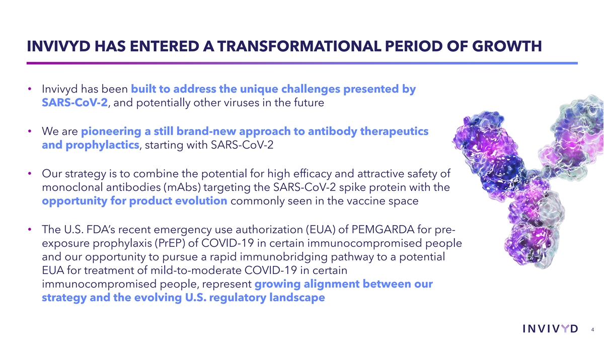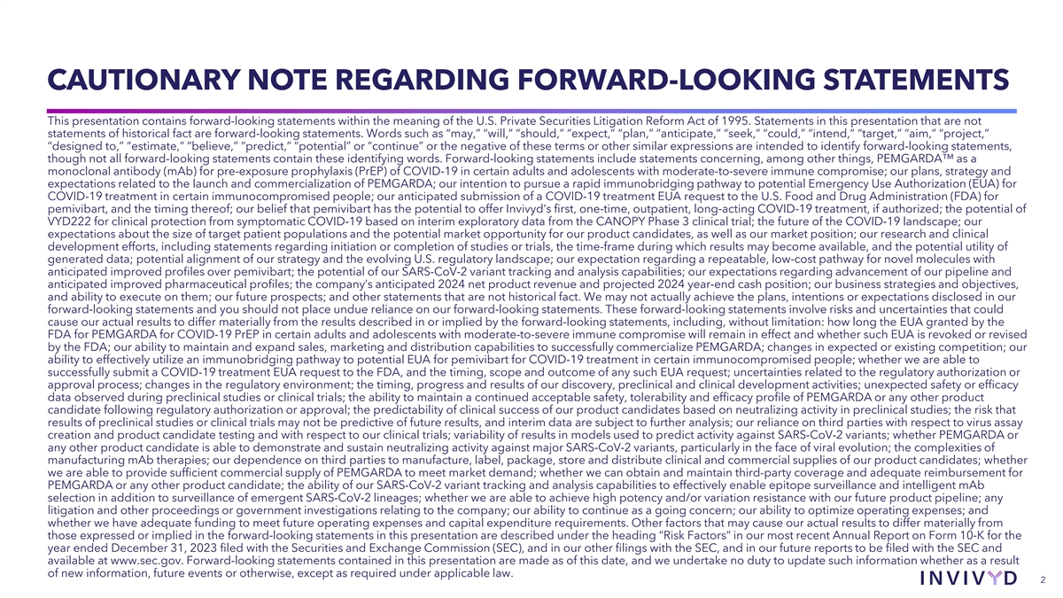 CAUTIONARY NOTE REGARDING FORWARD-LOOKING STATEMENTS This presentation contains forward-looking statements within the meaning of the U.S. Private Securities Litigation Reform Act of 1995. Statements in this presentation that are not statements of historical fact are forward-looking statements. Words such as “may,” “will,” “should,” “expect,” “plan,” “anticipate,” “seek,” “could,” “intend,” “target,” “aim,” “project,” “designed to,” “estimate,” “believe,” “predict,” “potential” or “continue” or the negative of these terms or other similar expressions are intended to identify forward-looking statements, though not all forward-looking statements contain these identifying words. Forward-looking statements include statements concerning, among other things, PEMGARDA as a monoclonal antibody (mAb) for pre-exposure prophylaxis (PrEP) of COVID-19 in certain adults and adolescents with moderate-to-severe immune compromise; our plans, strategy and expectations related to the launch and commercialization of PEMGARDA; our intention to pursue a rapid immunobridging pathway to potential Emergency Use Authorization (EUA) for COVID-19 treatment in certain immunocompromised people; our anticipated submission of a COVID-19 treatment EUA request to the U.S. Food and Drug Administration (FDA) for pemivibart, and the timing thereof; our belief that pemivibart has the potential to offer Invivyd’s first, one-time, outpatient, long-acting COVID-19 treatment, if authorized; the potential of VYD222 for clinical protection from symptomatic COVID-19 based on interim exploratory data from the CANOPY Phase 3 clinical trial; the future of the COVID-19 landscape; our expectations about the size of target patient populations and the potential market opportunity for our product candidates, as well as our market position; our research and clinical development efforts, including statements regarding initiation or completion of studies or trials, the time-frame during which results may become available, and the potential utility of generated data; potential alignment of our strategy and the evolving U.S. regulatory landscape; our expectation regarding a repeatable, low-cost pathway for novel molecules with anticipated improved profiles over pemivibart; the potential of our SARS-CoV-2 variant tracking and analysis capabilities; our expectations regarding advancement of our pipeline and anticipated improved pharmaceutical profiles; the company’s anticipated 2024 net product revenue and projected 2024 year-end cash position; our business strategies and objectives, and ability to execute on them; our future prospects; and other statements that are not historical fact. We may not actually achieve the plans, intentions or expectations disclosed in our forward-looking statements and you should not place undue reliance on our forward-looking statements. These forward-looking statements involve risks and uncertainties that could cause our actual results to differ materially from the results described in or implied by the forward-looking statements, including, without limitation: how long the EUA granted by the FDA for PEMGARDA for COVID-19 PrEP in certain adults and adolescents with moderate-to-severe immune compromise will remain in effect and whether such EUA is revoked or revised by the FDA; our ability to maintain and expand sales, marketing and distribution capabilities to successfully commercialize PEMGARDA; changes in expected or existing competition; our ability to effectively utilize an immunobridging pathway to potential EUA for pemivibart for COVID-19 treatment in certain immunocompromised people; whether we are able to successfully submit a COVID-19 treatment EUA request to the FDA, and the timing, scope and outcome of any such EUA request; uncertainties related to the regulatory authorization or approval process; changes in the regulatory environment; the timing, progress and results of our discovery, preclinical and clinical development activities; unexpected safety or efficacy data observed during preclinical studies or clinical trials; the ability to maintain a continued acceptable safety, tolerability and efficacy profile of PEMGARDA or any other product candidate following regulatory authorization or approval; the predictability of clinical success of our product candidates based on neutralizing activity in preclinical studies; the risk that results of preclinical studies or clinical trials may not be predictive of future results, and interim data are subject to further analysis; our reliance on third parties with respect to virus assay creation and product candidate testing and with respect to our clinical trials; variability of results in models used to predict activity against SARS-CoV-2 variants; whether PEMGARDA or any other product candidate is able to demonstrate and sustain neutralizing activity against major SARS-CoV-2 variants, particularly in the face of viral evolution; the complexities of manufacturing mAb therapies; our dependence on third parties to manufacture, label, package, store and distribute clinical and commercial supplies of our product candidates; whether we are able to provide sufficient commercial supply of PEMGARDA to meet market demand; whether we can obtain and maintain third-party coverage and adequate reimbursement for PEMGARDA or any other product candidate; the ability of our SARS-CoV-2 variant tracking and analysis capabilities to effectively enable epitope surveillance and intelligent mAb selection in addition to surveillance of emergent SARS-CoV-2 lineages; whether we are able to achieve high potency and/or variation resistance with our future product pipeline; any litigation and other proceedings or government investigations relating to the company; our ability to continue as a going concern; our ability to optimize operating expenses; and whether we have adequate funding to meet future operating expense