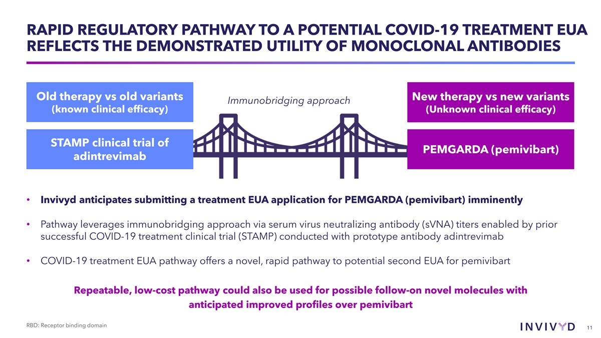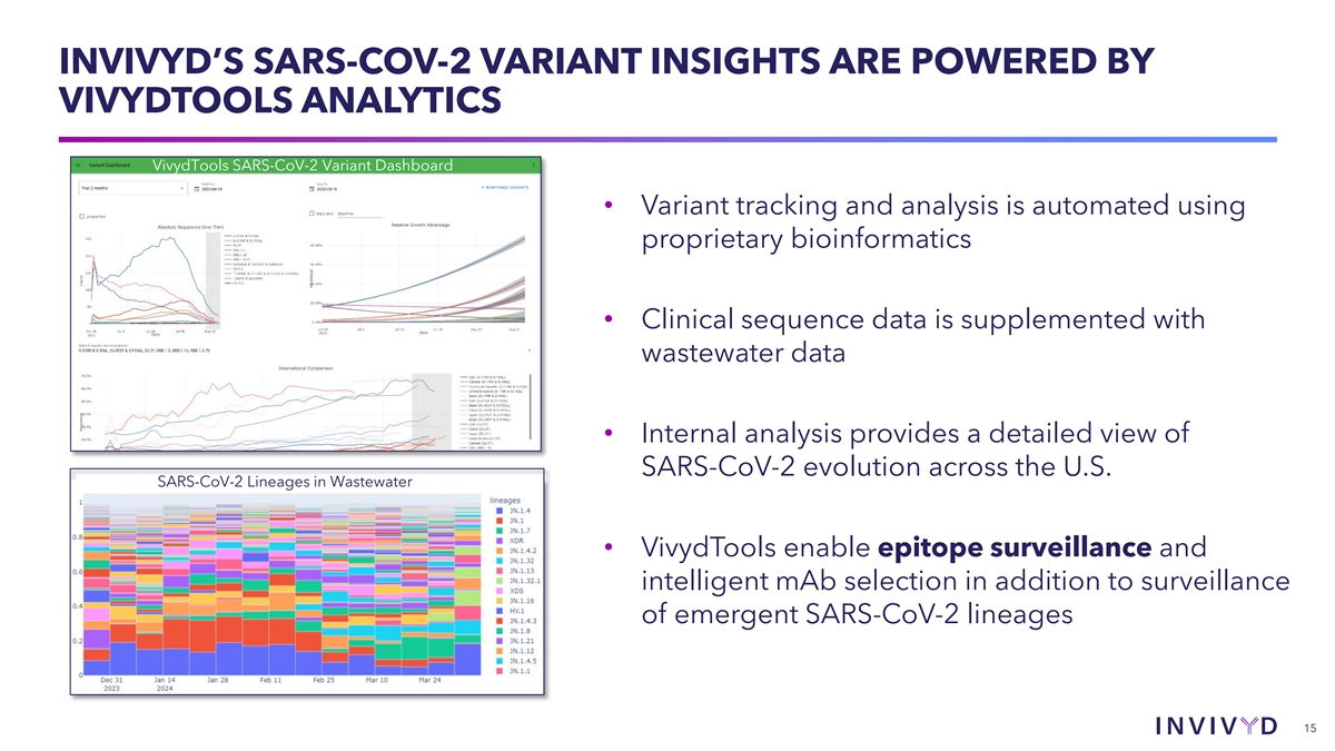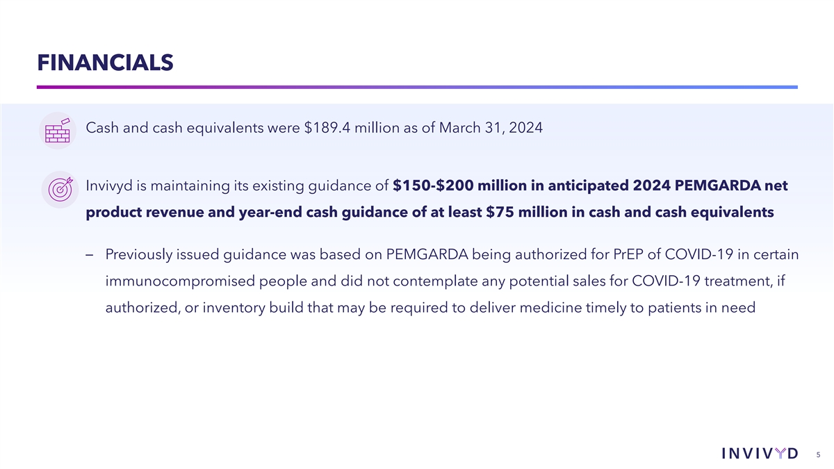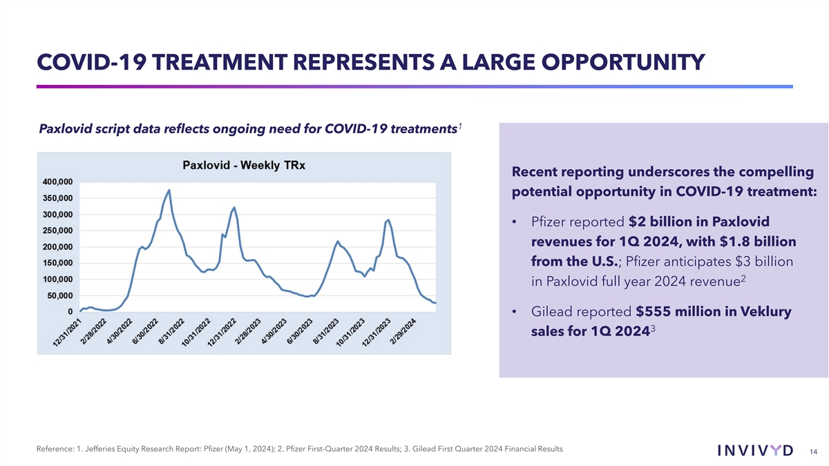 CAUTIONARY NOTE REGARDING FORWARD-LOOKING STATEMENTS This presentation contains forward-looking statements within the meaning of the U.S. Private Securities Litigation Reform Act of 1995. Statements in this presentation that are not statements of historical fact are forward-looking statements. Words such as “may,” “will,” “should,” “expect,” “plan,” “anticipate,” “seek,” “could,” “intend,” “target,” “aim,” “project,” “designed to,” “estimate,” “believe,” “predict,” “potential” or “continue” or the negative of these terms or other similar expressions are intended to identify forward-looking statements, though not all forward-looking statements contain these identifying words. Forward-looking statements include statements concerning, among other things, PEMGARDA as a monoclonal antibody (mAb) for pre-exposure prophylaxis (PrEP) of COVID-19 in certain adults and adolescents with moderate-to-severe immune compromise; our plans, strategy and expectations related to the launch and commercialization of PEMGARDA; our intention to pursue a rapid immunobridging pathway to potential Emergency Use Authorization (EUA) for COVID-19 treatment in certain immunocompromised people; our anticipated submission of a COVID-19 treatment EUA request to the U.S. Food and Drug Administration (FDA) for pemivibart, and the timing thereof; our belief that pemivibart has the potential to offer Invivyd’s first, one-time, outpatient, long-acting COVID-19 treatment, if authorized; the potential of VYD222 for clinical protection from symptomatic COVID-19 based on interim exploratory data from the CANOPY Phase 3 clinical trial; the future of the COVID-19 landscape; our expectations about the size of target patient populations and the potential market opportunity for our product candidates, as well as our market position; our research and clinical development efforts, including statements regarding initiation or completion of studies or trials, the time-frame during which results may become available, and the potential utility of generated data; potential alignment of our strategy and the evolving U.S. regulatory landscape; our expectation regarding a repeatable, low-cost pathway for novel molecules with anticipated improved profiles over pemivibart; the potential of our SARS-CoV-2 variant tracking and analysis capabilities; our expectations regarding advancement of our pipeline and anticipated improved pharmaceutical profiles; the company’s anticipated 2024 net product revenue and projected 2024 year-end cash position; our business strategies and objectives, and ability to execute on them; our future prospects; and other statements that are not historical fact. We may not actually achieve the plans, intentions or expectations disclosed in our forward-looking statements and you should not place undue reliance on our forward-looking statements. These forward-looking statements involve risks and uncertainties that could cause our actual results to differ materially from the results described in or implied by the forward-looking statements, including, without limitation: how long the EUA granted by the FDA for PEMGARDA for COVID-19 PrEP in certain adults and adolescents with moderate-to-severe immune compromise will remain in effect and whether such EUA is revoked or revised by the FDA; our ability to maintain and expand sales, marketing and distribution capabilities to successfully commercialize PEMGARDA; changes in expected or existing competition; our ability to effectively utilize an immunobridging pathway to potential EUA for pemivibart for COVID-19 treatment in certain immunocompromised people; whether we are able to successfully submit a COVID-19 treatment EUA request to the FDA, and the timing, scope and outcome of any such EUA request; uncertainties related to the regulatory authorization or approval process; changes in the regulatory environment; the timing, progress and results of our discovery, preclinical and clinical development activities; unexpected safety or efficacy data observed during preclinical studies or clinical trials; the ability to maintain a continued acceptable safety, tolerability and efficacy profile of PEMGARDA or any other product candidate following regulatory authorization or approval; the predictability of clinical success of our product candidates based on neutralizing activity in preclinical studies; the risk that results of preclinical studies or clinical trials may not be predictive of future results, and interim data are subject to further analysis; our reliance on third parties with respect to virus assay creation and product candidate testing and with respect to our clinical trials; variability of results in models used to predict activity against SARS-CoV-2 variants; whether PEMGARDA or any other product candidate is able to demonstrate and sustain neutralizing activity against major SARS-CoV-2 variants, particularly in the face of viral evolution; the complexities of manufacturing mAb therapies; our dependence on third parties to manufacture, label, package, store and distribute clinical and commercial supplies of our product candidates; whether we are able to provide sufficient commercial supply of PEMGARDA to meet market demand; whether we can obtain and maintain third-party coverage and adequate reimbursement for PEMGARDA or any other product candidate; the ability of our SARS-CoV-2 variant tracking and analysis capabilities to effectively enable epitope surveillance and intelligent mAb selection in addition to surveillance of emergent SARS-CoV-2 lineages; whether we are able to achieve high potency and/or variation resistance with our future product pipeline; any litigation and other proceedings or government investigations relating to the company; our ability to continue as a going concern; our ability to optimize operating expenses; and whether we have adequate funding to meet future operating expense