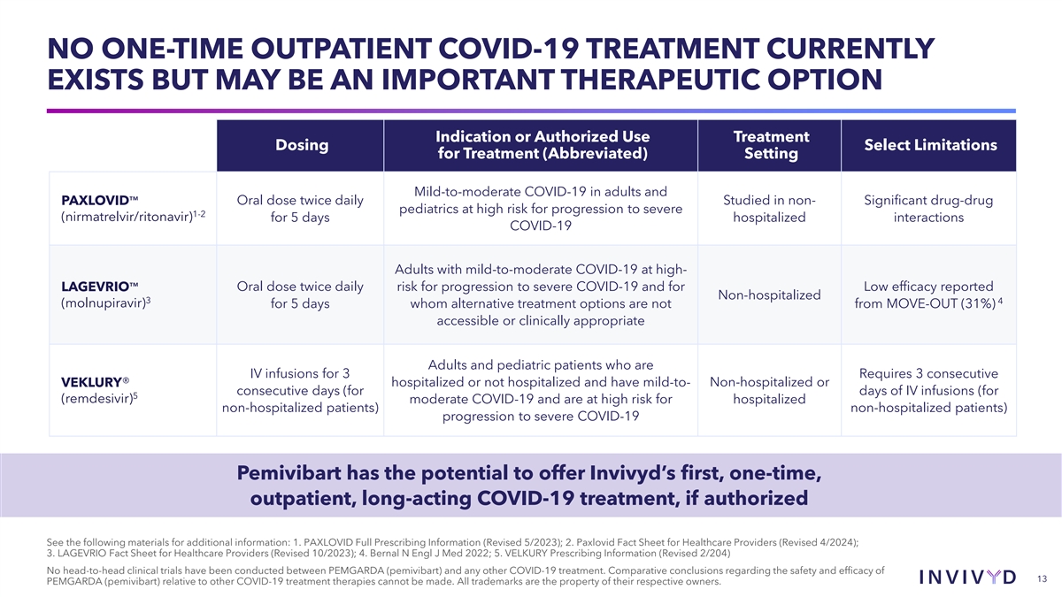 NO ONE-TIME OUTPATIENT COVID-19 TREATMENT CURRENTLY EXISTS BUT MAY BE AN IMPORTANT THERAPEUTIC OPTION Indication or Authorized Use Treatment Dosing Select Limitations for Treatment (Abbreviated) Setting Mild-to-moderate COVID-19 in adults and Oral dose twice daily Studied in non- Significant drug-drug PAXLOVID pediatrics at high risk for progression to severe 1-2 (nirmatrelvir/ritonavir) for 5 days hospitalized interactions COVID-19 Adults with mild-to-moderate COVID-19 at high- Oral dose twice daily risk for progression to severe COVID-19 and for Low efficacy reported LAGEVRIO Non-hospitalized 3 4 (molnupiravir) for 5 days whom alternative treatment options are not from MOVE-OUT (31%) accessible or clinically appropriate Adults and pediatric patients who are IV infusions for 3 Requires 3 consecutive VEKLURY® hospitalized or not hospitalized and have mild-to- Non-hospitalized or consecutive days (for days of IV infusions (for 5 (remdesivir) moderate COVID-19 and are at high risk for hospitalized non-hospitalized patients) non-hospitalized patients) progression to severe COVID-19 Pemivibart has the potential to offer Invivyd’s first, one-time, outpatient, long-acting COVID-19 treatment, if authorized See the following materials for additional information: 1. PAXLOVID Full Prescribing Information (Revised 5/2023); 2. Paxlovid Fact Sheet for Healthcare Providers (Revised 4/2024); 3. LAGEVRIO Fact Sheet for Healthcare Providers (Revised 10/2023); 4. Bernal N Engl J Med 2022; 5. VELKURY Prescribing Information (Revised 2/204) No head-to-head clinical trials have been conducted between PEMGARDA (pemivibart) and any other COVID-19 treatment. Comparative conclusions regarding the safety and efficacy of 13 PEMGARDA (pemivibart) relative to other COVID-19 treatment therapies cannot be made. All trademarks are the property of their respective owners.