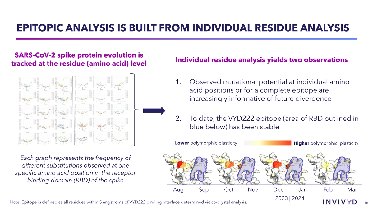 INVIVYD’S SARS-COV-2 VARIANT INSIGHTS ARE POWERED BY VIVYDTOOLS ANALYTICS VivydTools SARS-CoV-2 Variant Dashboard • Variant tracking and analysis is automated using proprietary bioinformatics • Clinical sequence data is supplemented with wastewater data • Internal analysis provides a detailed view of SARS-CoV-2 evolution across the U.S. SARS-CoV-2 Lineages in Wastewater • VivydTools enable epitope surveillance and intelligent mAb selection in addition to surveillance of emergent SARS-CoV-2 lineages 15