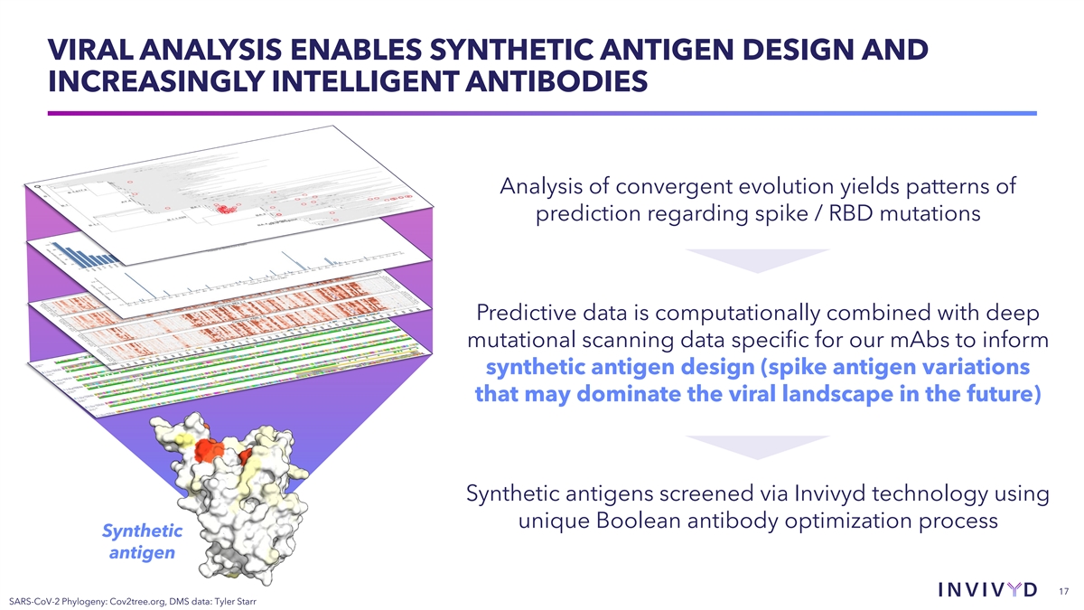 VIRAL ANALYSIS ENABLES SYNTHETIC ANTIGEN DESIGN AND INCREASINGLY INTELLIGENT ANTIBODIES Analysis of convergent evolution yields patterns of prediction regarding spike / RBD mutations Predictive data is computationally combined with deep mutational scanning data specific for our mAbs to inform synthetic antigen design (spike antigen variations that may dominate the viral landscape in the future) Synthetic antigens screened via Invivyd technology using unique Boolean antibody optimization process Synthetic antigen 17 SARS-CoV-2 Phylogeny: Cov2tree.org, DMS data: Tyler Starr