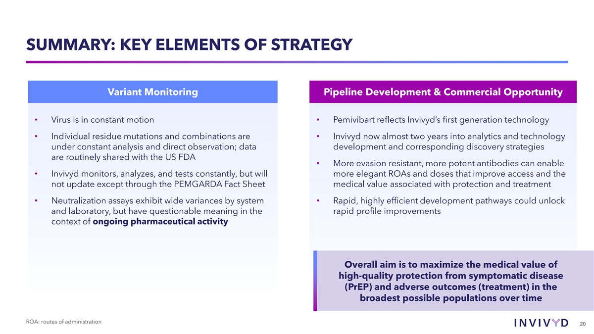 INVIVYD’S PIPELINE IS RAPIDLY ADVANCING TOWARD HIGHER INTELLIGENCE AND ANTICIPATED IMPROVED PHARMACEUTICAL PROFILES • First generation, mined from SARS-CoV-1 survivor serum and optimized against Wuhan Adintrevimab • Optimized on one dimension (ACE2:RBD affinity) (ADG20) • 2nd generation, engineered from ADG20 to recover activity against BA.2 PEMGARDA • Engineered for single dimension (ACE2:RBD breadth), constraining potency (pemivibart) • 3rd generation, optimized for post-Omicron two-dimensional problem (ACE2:RBD, immune evasion) VYD2311 • Highly potent and demonstrated post-Omicron variant resistance • Leverages evolutionary intelligence from VivydTools analysis and predictive synthetic antigens VYDXXXX • Expected high potency and designed for high variation resistance 19