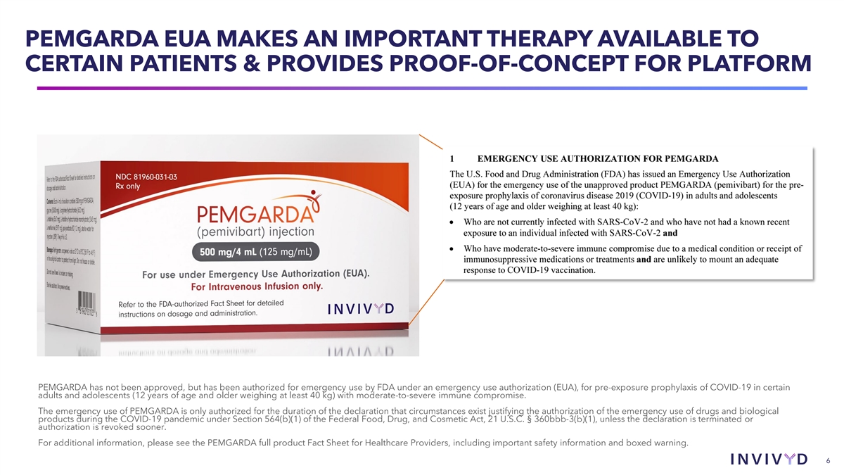 PEMGARDA EUA MAKES AN IMPORTANT THERAPY AVAILABLE TO CERTAIN PATIENTS & PROVIDES PROOF-OF-CONCEPT FOR PLATFORM PEMGARDA has not been approved, but has been authorized for emergency use by FDA under an emergency use authorization (EUA), for pre-exposure prophylaxis of COVID-19 in certain adults and adolescents (12 years of age and older weighing at least 40 kg) with moderate-to-severe immune compromise. The emergency use of PEMGARDA is only authorized for the duration of the declaration that circumstances exist justifying the authorization of the emergency use of drugs and biological products during the COVID-19 pandemic under Section 564(b)(1) of the Federal Food, Drug, and Cosmetic Act, 21 U.S.C. § 360bbb-3(b)(1), unless the declaration is terminated or authorization is revoked sooner. For additional information, please see the PEMGARDA full product Fact Sheet for Healthcare Providers, including important safety information and boxed warning. 6