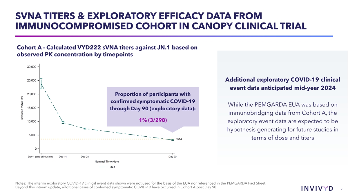 THE PEMGARDA EUA FOR PRE-EXPOSURE PROPHYLAXIS IS BASED ON AN IMMUNOBRIDGING CLINICAL TRIAL (CANOPY) CANOPY CLINICAL TRIAL OVERVIEW VYD222 4500 mg IV (n≈300) COHORT A Open Label Moderate-to-severe immune // compromise (N≈300) Day 1 Month 3 Month 12 (Dosing) (Redosing) (Last visit) Primary endpoints: • Safety/tolerability • Day 28 serum virus neutralizing antibody (sVNA) titers (calculated from the pharmacokinetic concentrations of VYD222 and the EC value for 50 VYD222 against relevant SARS-CoV-2 variants) VYD222 4500 mg IV (n≈300) COHORT B At risk of SARS-CoV-2 exposure 2:1 Randomization due to regular unmasked indoor // Month 12 Day 1 Month 3 interactions (N≈450) (Last visit) (Dosing) (Redosing) Primary endpoint: Placebo IV (n≈150) • Safety/tolerability 8 Source: F: NCT06039449; IV, intravenous; SAEs, serious adverse events; AEs, adverse events