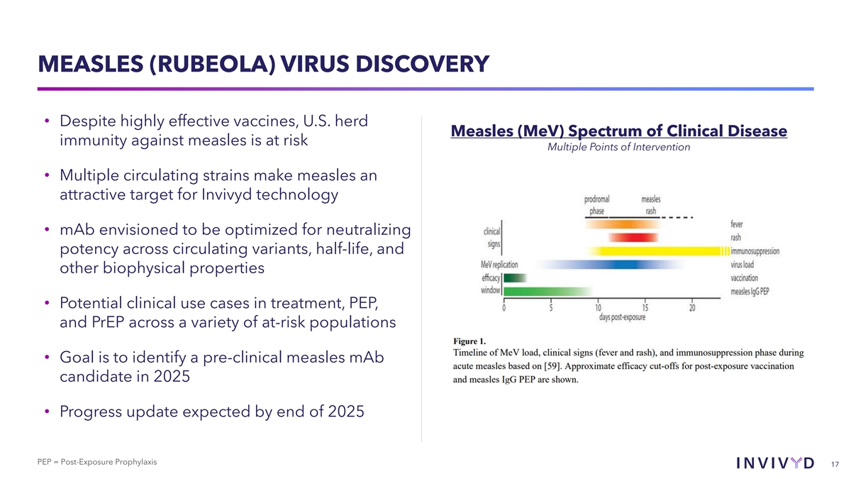 RESPIRATORY SYNCYTIAL VIRUS (RSV) DISCOVERY • Well-developed mAb medical category devoted to Fusion Protein Trimer prevention of RSV in neonates and children <24 months • Current key molecules: o Pavilizumab (1998) - AstraZeneca o Nirsevimab (2023) - Sanofi o Clesrovimab (2025 expected) - Merck • Opportunity to deploy Invivyd technology to create a best-in-class profile along one or more dimensions: o Neutralizing Potency (correlates to LRTI prevention rate) Pantaleo Nat Rev Drug Dis 2022 o Half-life o Barrier to resistance • Progress update expected by end of 2025 LRTI = Lower Respiratory Tract Infection 16