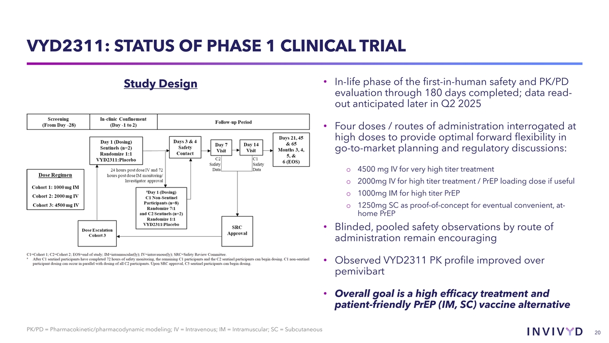 VYD2311 OVERVIEW • VYD2311 is the third iteration of Invivyd’s platform approach targeting SARS-CoV-2 spike protein • Carries 99%+ sequence identity to predicate antibodies, ADG20 and pemivibart; approximately same or less structural change, version to version, as mRNA vaccine updates • Series of antibodies is honing access to a conserved epitope; goal is to refine antibody properties and substantially expand TAM with successive iterations TAM = Total Addressable Market 19