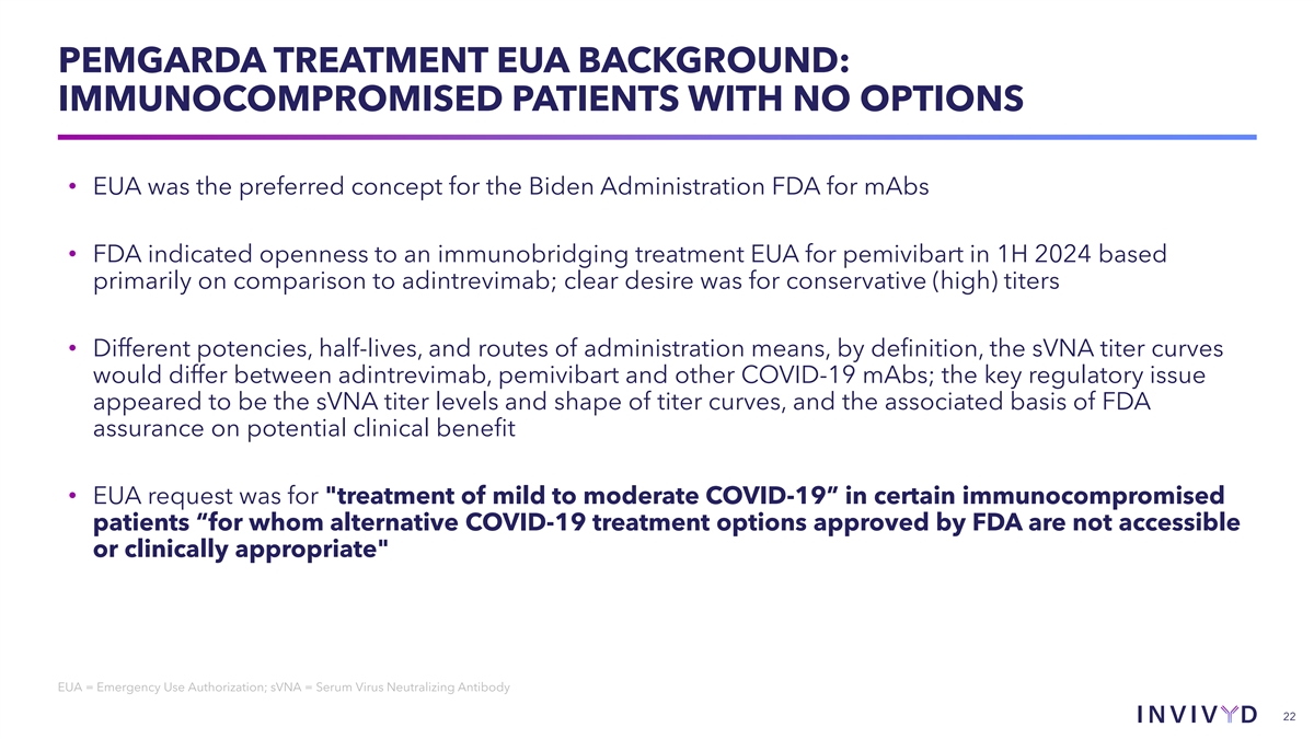 PEMGARDA TREATMENT EUA BACKGROUND: IMMUNOCOMPROMISED PATIENTS WITH NO OPTIONS • EUA was the preferred concept for the Biden Administration FDA for mAbs • FDA indicated openness to an immunobridging treatment EUA for pemivibart in 1H 2024 based primarily on comparison to adintrevimab; clear desire was for conservative (high) titers • Different potencies, half-lives, and routes of administration means, by definition, the sVNA titer curves would differ between adintrevimab, pemivibart and other COVID-19 mAbs; the key regulatory issue appeared to be the sVNA titer levels and shape of titer curves, and the associated basis of FDA assurance on potential clinical benefit • EUA request was for treatment of mild to moderate COVID-19” in certain immunocompromised patients “for whom alternative COVID-19 treatment options approved by FDA are not accessible or clinically appropriate EUA = Emergency Use Authorization; sVNA = Serum Virus Neutralizing Antibody 22