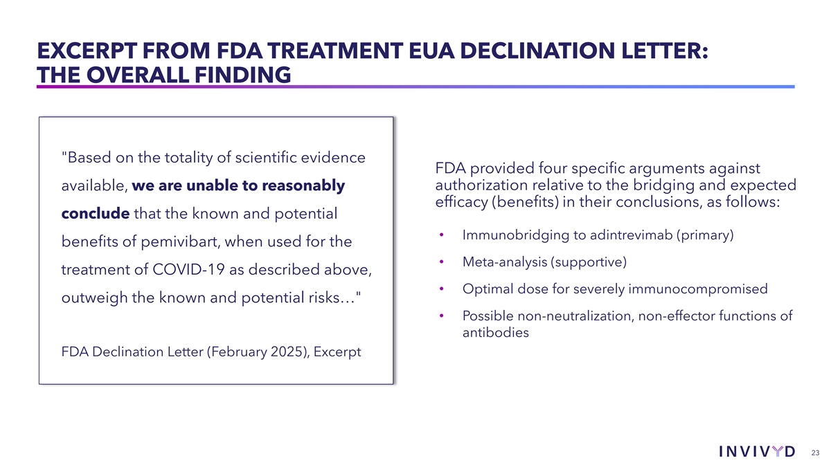 EXCERPT FROM FDA TREATMENT EUA DECLINATION LETTER: THE OVERALL FINDING Based on the totality of scientific evidence FDA provided four specific arguments against available, we are unable to reasonably authorization relative to the bridging and expected efficacy (benefits) in their conclusions, as follows: conclude that the known and potential • Immunobridging to adintrevimab (primary) benefits of pemivibart, when used for the • Meta-analysis (supportive) treatment of COVID-19 as described above, • Optimal dose for severely immunocompromised outweigh the known and potential risks… • Possible non-neutralization, non-effector functions of antibodies FDA Declination Letter (February 2025), Excerpt 23