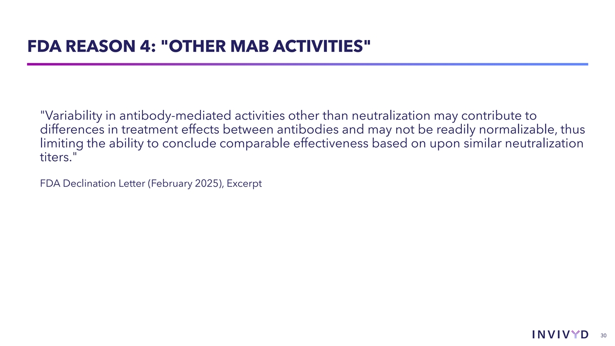 FDA REASON 4: OTHER MAB ACTIVITIES Variability in antibody-mediated activities other than neutralization may contribute to differences in treatment effects between antibodies and may not be readily normalizable, thus limiting the ability to conclude comparable effectiveness based on upon similar neutralization titers. FDA Declination Letter (February 2025), Excerpt 30