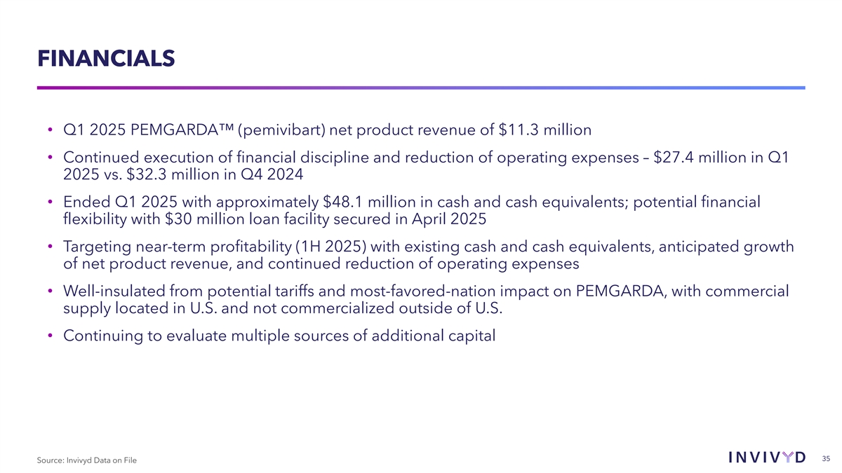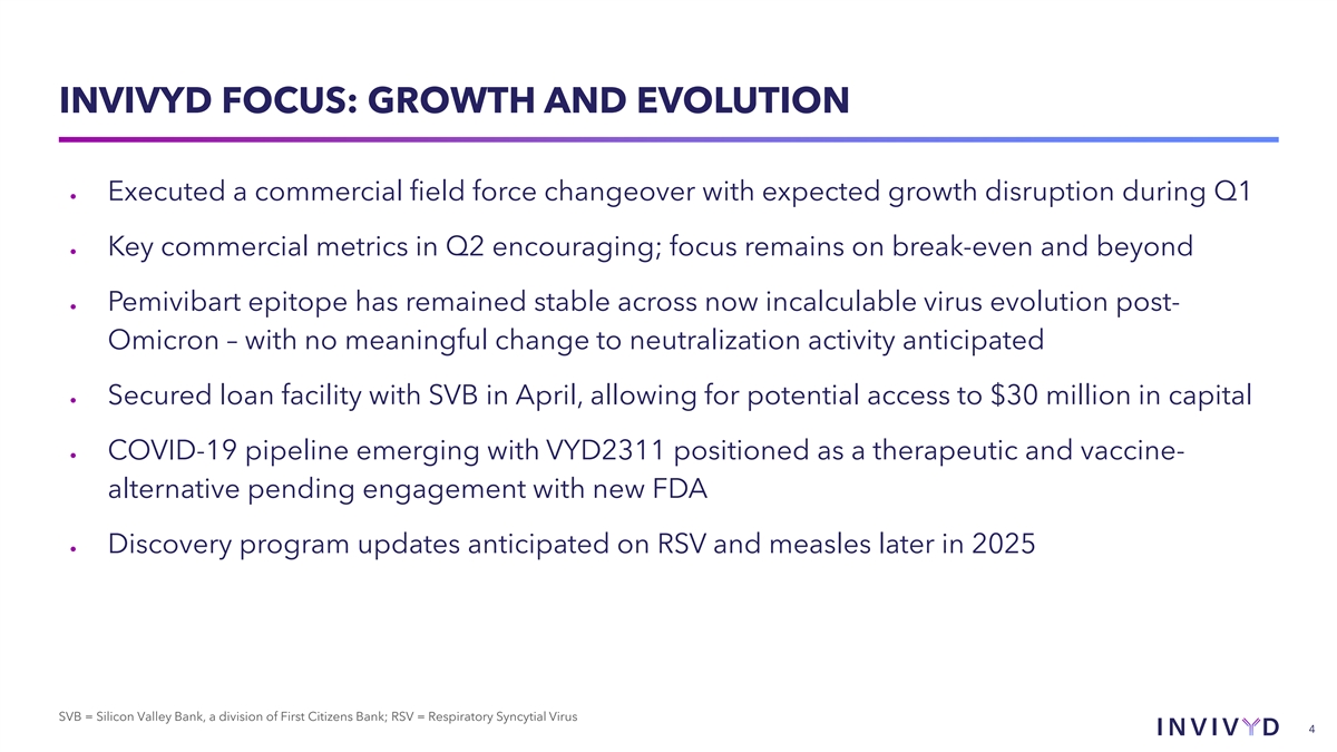 CAUTIONARY NOTE REGARDING FORWARD-LOOKING STATEMENTS This presentation contains forward-looking statements within the meaning of the U.S. Private Securities Litigation Reform Act of 1995. Statements in this presentation that are not statements of historical fact are forward-looking statements. Words such as “may,” “will,” “should,” “expect,” “plan,” “anticipate,” “seek,” “could,” “intend,” “target,” “aim,” “project,” “designed to,” “estimate,” “believe,” “predict,” “potential” or “continue” or the negative of these terms or other similar expressions are intended to identify forward-looking statements, though not all forward-looking statements contain these identifying words. Forward-looking statements include statements concerning, among other things, PEMGARDA (pemivibart) as a monoclonal antibody (mAb) for pre-exposure prophylaxis (PrEP) of COVID-19 in certain immunocompromised patients; the company’s plans, strategies, goals and expectations related to the commercialization of PEMGARDA, including key commercial metrics; the company’s aim for near-term profitability; the company’s belief that its existing cash and cash equivalents, anticipated growth of net product revenue, and continued reduction of operating expenses will be sufficient to fund operations through profitability; expectations related to the company’s loan facility; the company’s research and clinical development efforts, including statements regarding initiation or completion of studies or trials, the time-frame during which results may become available; the potential of VYD2311 as a novel mAb candidate that may be able to deliver clinically meaningful titer levels through more patient-friendly means, and potentially available regulatory pathways; the company’s discovery efforts, including for respiratory syncytial virus (RSV) and measles; the company’s expectations regarding the neutralization activity of pemivibart and VYD2311 against SARS-CoV-2 variants; the government and regulatory landscape; the company’s business strategies and objectives, and ability to execute on them; potential market opportunities; the company’s future prospects; and other statements that are not historical fact. The company may not actually achieve the plans, intentions or expectations disclosed in the company’s forward-looking statements and you should not place undue reliance on the company’s forward-looking statements. These forward-looking statements involve risks and uncertainties that could cause the company’s actual results to differ materially from the results described in or implied by the forward-looking statements, including, without limitation: uncertainties regarding the company’s expectations, projections and estimates regarding future costs and expenses, future revenue, capital requirements, and the availability of and the need for additional financing; whether the company’s cash and cash equivalents are sufficient to support its operating plan for as long as anticipated; uncertainties regarding market acceptance, payor coverage and reimbursement, or future revenue generated by PEMGARDA; how long the EUA granted by the U.S. Food & Drug Administration (FDA) for PEMGARDA for COVID-19 PrEP in certain immunocompromised patients will remain in effect and whether such EUA is revised or revoked by the FDA; the ability to maintain a continued acceptable safety, tolerability and efficacy profile of any product candidate following regulatory authorization or approval; the success of the company’s in-house sales force, and company’s ability to maintain and expand sales, marketing and distribution capabilities to successfully commercialize PEMGARDA; changes in expected or existing competition; changes in the regulatory environment; the outcome of the company’s engagement with regulators; uncertainties related to the regulatory authorization or approval process, and available development and regulatory pathways; the timing, progress and results of the company’s discovery, preclinical and clinical development activities; unexpected safety or efficacy data observed during preclinical studies or clinical trials; the predictability of clinical success of the company’s product candidates based on neutralizing activity in nonclinical studies; the risk that results of nonclinical studies or clinical trials may not be predictive of future results, and interim data are subject to further analysis; the company’s reliance on third parties; potential variability in neutralizing activity of product candidates tested in different assays, such as pseudovirus assays and authentic assays; variability of results in models and methods used to predict activity against SARS-CoV-2 variants; whether the epitope that pemivibart and VYD2311 targets remains structurally intact; whether the company’s product candidates are able to demonstrate and sustain neutralizing activity against major SARS-CoV-2 variants, particularly in the face of viral evolution; whether the company’s integrated technology platform is able to produce mAbs with broad and durable viral protection along with improved drug properties; the complexities of manufacturing mAb therapies; macroeconomic and political uncertainties; the company’s ability to realize the anticipated benefits of its loan facility; the company’s ability to continue as a going concern; and whether the company has adequate funding to meet future operating expenses and capital expenditure requirements. Other factors that may cause the company’s actual results to differ materially from those expressed or implied in the forward-looking statements in this presentation are described under the heading “Risk Factors” in the company’s Annual Report on Form 10-K for the year ended December 31, 2024, as filed with the Securities and Exchange Commission (SEC), and in the company’s other filings with the SEC, a