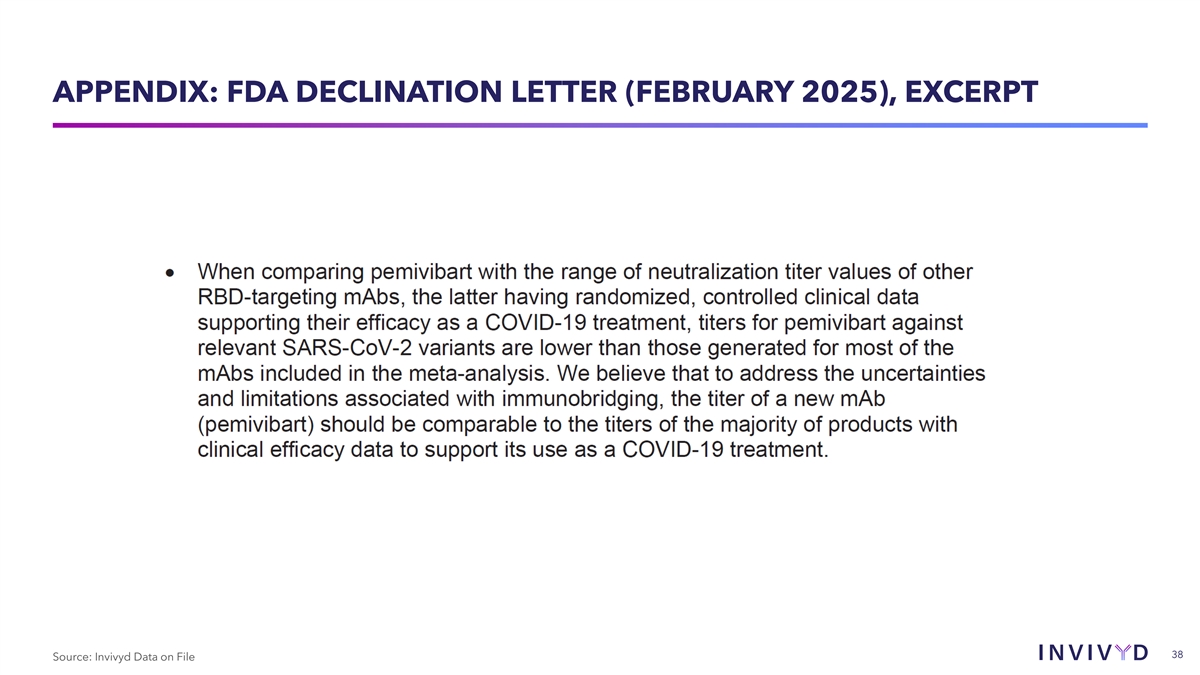 APPENDIX: FDA DECLINATION LETTER (FEBRUARY 2025), EXCERPT 38 Source: Invivyd Data on File