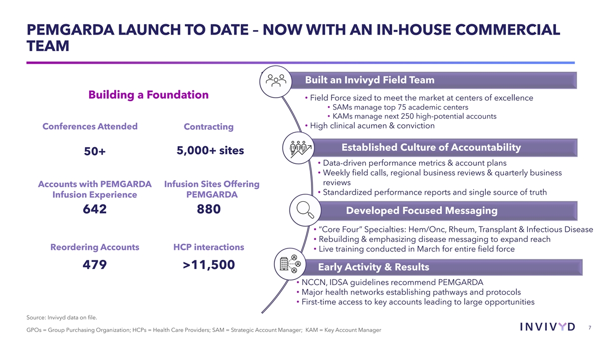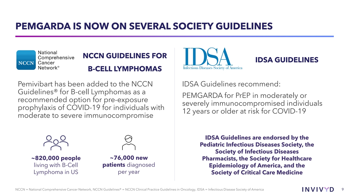 PEMGARDA LAUNCH TO DATE – NOW WITH AN IN-HOUSE COMMERCIAL TEAM Built an Invivyd Field Team Building a Foundation • Field Force sized to meet the market at centers of excellence • SAMs manage top 75 academic centers • KAMs manage next 250 high-potential accounts • High clinical acumen & conviction Conferences Attended Contracting Established Culture of Accountability 5,000+ sites 50+ • Data-driven performance metrics & account plans • Weekly field calls, regional business reviews & quarterly business reviews Accounts with PEMGARDA Infusion Sites Offering • Standardized performance reports and single source of truth Infusion Experience PEMGARDA 642 880 Developed Focused Messaging • “Core Four” Specialties: Hem/Onc, Rheum, Transplant & Infectious Disease • Rebuilding & emphasizing disease messaging to expand reach Reordering Accounts HCP interactions • Live training conducted in March for entire field force 479 >11,500 Early Activity & Results • NCCN, IDSA guidelines recommend PEMGARDA • Major health networks establishing pathways and protocols • First-time access to key accounts leading to large opportunities Source: Invivyd data on file. 7 7 GPOs = Group Purchasing Organization; HCPs = Health Care Providers; SAM = Strategic Account Manager; KAM = Key Account Manager