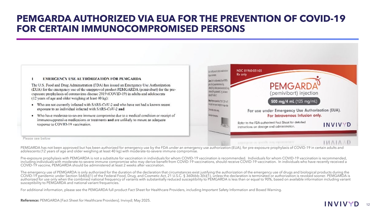 PEMGARDA AUTHORIZED VIA EUA FOR THE PREVENTION OF COVID-19 FOR CERTAIN IMMUNOCOMPROMISED PERSONS PEMGARDA has not been approved but has been authorized for emergency use by the FDA under an emergency use authorization (EUA), for pre-exposure prophylaxis of COVID-19 in certain adults and adolescents (12 years of age and older weighing at least 40 kg) with moderate-to-severe immune compromise. Pre-exposure prophylaxis with PEMGARDA is not a substitute for vaccination in individuals for whom COVID-19 vaccination is recommended. Individuals for whom COVID-19 vaccination is recommended, including individuals with moderate-to-severe immune compromise who may derive benefit from COVID-19 vaccinations, should receive COVID-19 vaccination. In individuals who have recently received a COVID-19 vaccine, PEMGARDA should be administered at least 2 weeks after vaccination. The emergency use of PEMGARDA is only authorized for the duration of the declaration that circumstances exist justifying the authorization of the emergency use of drugs and biological products during the COVID-19 pandemic under Section 564(b)(1) of the Federal Food, Drug, and Cosmetic Act, 21 U.S.C. § 360bbb-3(b)(1), unless the declaration is terminated or authorization is revoked sooner. PEMGARDA is authorized for use only when the combined national frequency of variants with substantially reduced susceptibility to PEMGARDA is less than or equal to 90%, based on available information including variant susceptibility to PEMGARDA and national variant frequencies. For additional information, please see the PEMGARDA full product Fact Sheet for Healthcare Providers, including Important Safety Information and Boxed Warning. Reference: PEMGARDA [Fact Sheet for Healthcare Providers]. Invivyd; May 2025. 12 12