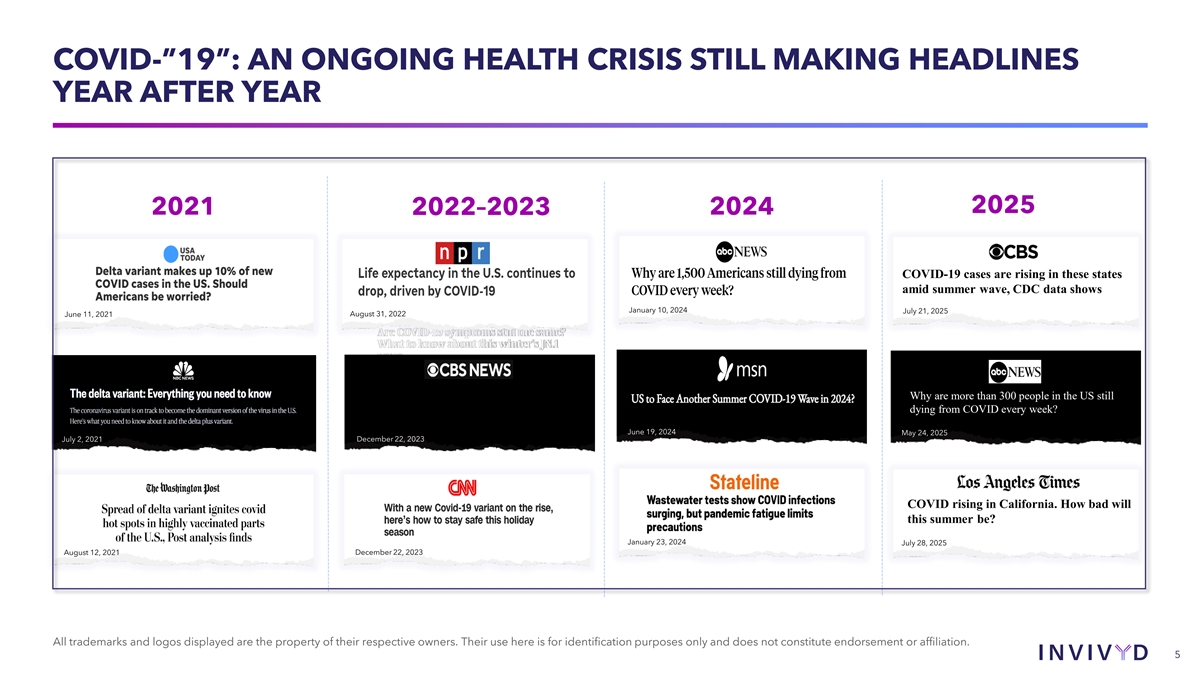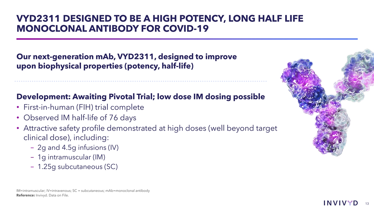 CAUTIONARY NOTE REGARDING FORWARD-LOOKING STATEMENTS This presentation contains forward-looking statements within the meaning of the U.S. Private Securities Litigation Reform Act of 1995. Statements in this presentation that are not statements of historical fact are forward-looking statements. Words such as “may,” “will,” “should,” “expect,” “plan,” “anticipate,” “seek,” “could,” “intend,” “target,” “aim,” “project,” “designed to,” “estimate,” “believe,” “predict,” “potential” or “continue” or the negative of these terms or other similar expressions are intended to identify forward-looking statements, though not all forward-looking statements contain these identifying words. Forward-looking statements include statements concerning, among other things, expectations about the COVID-19 landscape and impact on Americans; the belief that COVID-19 vaccines do not provide sufficient protection; the potential of monoclonal antibodies (mAbs) to robustly protect people from getting sick with COVID-19; the potential of PEMGARDA® (pemivibart) as a mAb for pre-exposure prophylaxis (PrEP) of COVID-19 in certain adults and adolescents with moderate-to-severe immune compromise; our plans, strategy and expectations related to the commercialization of PEMGARDA; the potential of VYD2311 as a high potency, long half life mAb with improved biophysical properties; our goals with respect to the target product profile of VYD2311 and expected advantages of VYD2311; estimates regarding the size of target patient populations and the potential market opportunity for our product candidates, as well as our market position; our research and clinical development efforts, including statements regarding initiation or completion of studies or trials, the time-frame during which results may become available, and the potential utility of generated data; our expectations regarding regulatory alignment with the U.S. Food and Drug Administration (FDA); the design of our proprietary platform to address evolution and broad medical need; the potential of our pipeline; our goals with respect to VYD25XY series mAbs and additional diseases and indications (e.g., RSV, measles, lyme); our business strategies and objectives, and ability to execute on them; our future prospects; future investments and anticipated R&D developments; our goal of near-term profitability; and other statements that are not historical fact. We may not actually achieve the plans, intentions or expectations disclosed in our forward-looking statements and you should not place undue reliance on our forward-looking statements. These forward-looking statements involve risks and uncertainties that could cause our actual results to differ materially from the results described in or implied by the forward-looking statements, including, without limitation: how long the emergency use authorization (EUA) granted by the FDA for PEMGARDA for COVID-19 PrEP in certain immunocompromised patients will remain in effect and whether such EUA is revised or revoked by the FDA; the ability to maintain a continued acceptable safety, tolerability and efficacy profile of any product candidate following regulatory authorization or approval; the success of the company’s in-house sales force, and company’s ability to maintain and expand sales, marketing and distribution capabilities to successfully commercialize PEMGARDA; changes in expected or existing competition; changes in the regulatory environment; the outcome of the company’s engagement with regulators; uncertainties related to the regulatory authorization or approval process, and available development and regulatory pathways; uncertainties related to reaching agreement with FDA on the safety database size for the pivotal clinical trial of VYD2311 and full protocol review; the timing, progress and results of the company’s discovery, preclinical and clinical development activities; unexpected safety or efficacy data observed during preclinical studies or clinical trials; the predictability of clinical success of the company’s product candidates based on neutralizing activity in nonclinical studies; the risk that results of nonclinical studies or clinical trials may not be predictive of future results, and interim data are subject to further analysis; the company’s reliance on third parties; potential variability in neutralizing activity of product candidates tested in different assays, such as pseudovirus assays and authentic assays; variability of results in models and methods used to predict activity against SARS-CoV-2 variants; whether the epitope that pemivibart and VYD2311 targets remains structurally intact; whether the company’s product candidates are able to demonstrate and sustain neutralizing activity against major SARS-CoV-2 variants, particularly in the face of viral evolution; whether the company’s integrated technology platform is able to produce mAbs with broad and durable viral protection along with improved drug properties; the complexities of manufacturing mAb therapies, and availability of quantities of commercial product in the future, if authorized or approved; macroeconomic and political uncertainties; uncertainties regarding the company’s expectations, projections and estimates regarding future costs and expenses, future revenue, capital requirements, and the availability of and the need for additional financing; whether the company’s cash and cash equivalents are sufficient to support its operating plan for as long as anticipated; uncertainties regarding market acceptance, payor coverage and reimbursement, or future revenue generated by PEMGARDA; the company’s ability to realize the anticipated benefits of its term loan facility; the company’s ability to continue as a going concern; and whether the company has adequate funding to meet future operating expenses and capital expenditure requirements. Other factors tha