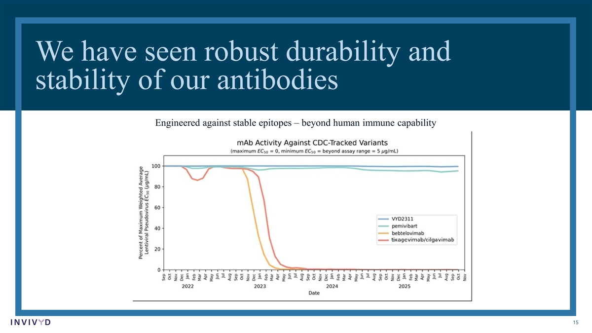 We have seen robust durability and stability of our antibodies Engineered against stable epitopes – beyond human immune capability 15