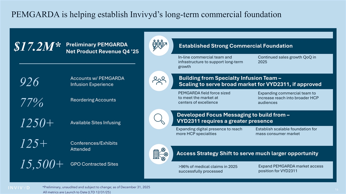PEMGARDA is helping establish Invivyd’s long-term commercial foundation Preliminary PEMGARDA Established Strong Commercial Foundation $17.2M* Net Product Revenue Q4 ’25 In-line commercial team and Continued sales growth QoQ in infrastructure to support long-term 2025 growth Building from Specialty Infusion Team – Accounts w/ PEMGARDA Infusion Experience 926 Scaling to serve broad market for VYD2311, if approved PEMGARDA field force sized Expanding commercial team to to meet the market at increase reach into broader HCP Reordering Accounts centers of excellence audiences 77% Developed Focus Messaging to build from – VYD2311 requires a greater presence Available Sites Infusing 1250+ Expanding digital presence to reach Establish scalable foundation for more HCP specialties mass consumer market Conferences/Exhibits 125+ Attended Access Strategy Shift to serve much larger opportunity GPO Contracted Sites Expand PEMGARDA market access >96% of medical claims in 2025 15,500+ position for VYD2311 successfully processed *Preliminary, unaudited and subject to change; as of December 31, 2025 16 All metrics are Launch to Date (LTD 12/31/25)