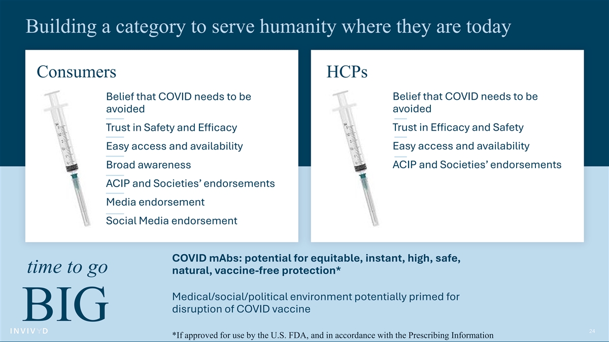 Building a category to serve humanity where they are today Consumers HCPs Belief that COVID needs to be Belief that COVID needs to be avoided avoided Trust in Safety and Efficacy Trust in Efficacy and Safety Easy access and availability Easy access and availability CP Broad awareness ACIP and Societies’ endorsements ACIP and Societies’ endorsements Media endorsement Social Media endorsement COVID mAbs: potential for equitable, instant, high, safe, time to go natural, vaccine-free protection* Medical/social/political environment potentially primed for disruption of COVID vaccine BIG 24 *If approved for use by the U.S. FDA, and in accordance with the Prescribing Information