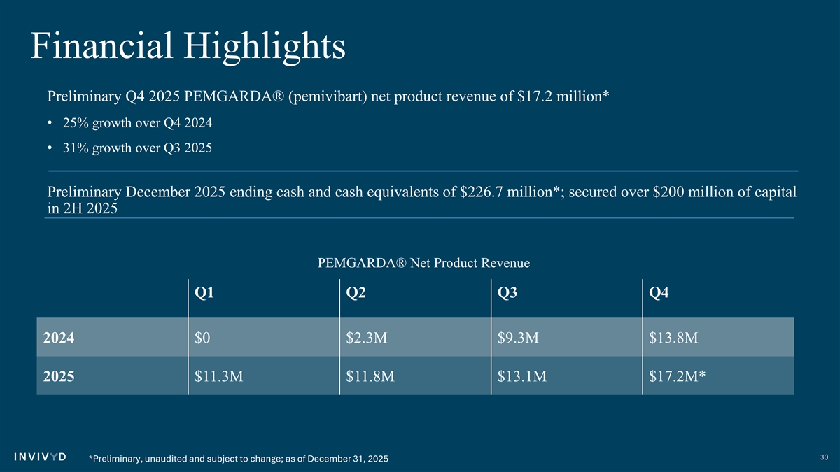 Financial Highlights Preliminary Q4 2025 PEMGARDA® (pemivibart) net product revenue of $17.2 million* • 25% growth over Q4 2024 • 31% growth over Q3 2025 Preliminary December 2025 ending cash and cash equivalents of $226.7 million*; secured over $200 million of capital in 2H 2025 PEMGARDA® Net Product Revenue Q1 Q2 Q3 Q4 2024 $0 $2.3M $9.3M $13.8M 2025 $11.3M $11.8M $13.1M $17.2M* 30 *Preliminary, unaudited and subject to change; as of December 31, 2025