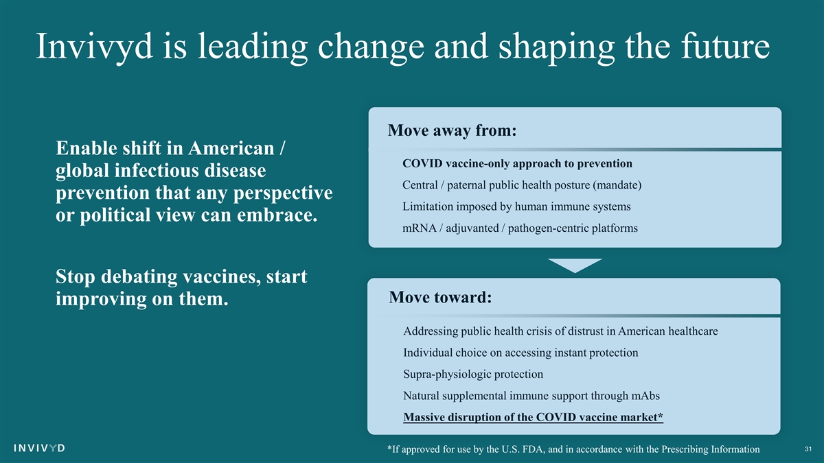 Invivyd is leading change and shaping the future Move away from: Enable shift in American / • COVID vaccine-only approach to prevention global infectious disease • Central / paternal public health posture (mandate) prevention that any perspective • Limitation imposed by human immune systems or political view can embrace. • mRNA / adjuvanted / pathogen-centric platforms Stop debating vaccines, start Move toward: improving on them. • Addressing public health crisis of distrust in American healthcare • Individual choice on accessing instant protection • Supra-physiologic protection • Natural supplemental immune support through mAbs • Massive disruption of the COVID vaccine market* 31 *If approved for use by the U.S. FDA, and in accordance with the Prescribing Information