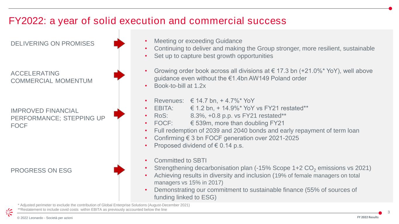 2 © 2022 Leonardo - Società per azioni Agenda FY 2022 Results • Key messages • Industrial review • Financial review • Q&A • Sector results • Appendix Alessandro Profumo, Chief Executive Officer Lucio Valerio Cioffi, General Manager Alessandra Genco, Chief Financial Officer • Medium-long term outlook Alessandro Profumo, Chief Executive Officer