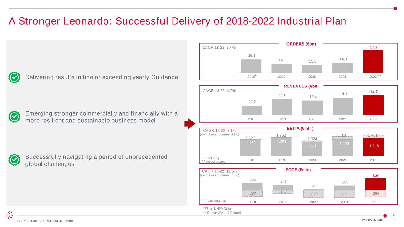 3 © 2022 Leonardo - Società per azioni DELIVERING ON PROMISES ACCELERATING COMMERCIAL MOMENTUM IMPROVED FINANCIAL PERFORMANCE; STEPPING UP FOCF PROGRESS ON ESG FY2022: a year of solid execution and commercial success • Meeting or exceeding Guidance • Continuing to deliver and making the Group stronger, more resilient, sustainable • Set up to capture best growth opportunities • Growing order book across all divisions at € 17.3 bn (+21.0%* YoY), well above guidance even without the €1.4bn AW149 Poland order • Book-to-bill at 1.2x • Revenues: € 14.7 bn, + 4.7%* YoY • EBITA: € 1.2 bn, + 14.9%* YoY vs FY21 restated** • RoS: 8.3%, +0.8 p.p. vs FY21 restated** • FOCF: € 539m, more than doubling FY21 • Full redemption of 2039 and 2040 bonds and early repayment of term loan • Confirming € 3 bn FOCF generation over 2021-2025 • Proposed dividend of € 0.14 p.s. • Committed to SBTI • Strengthening decarbonisation plan (-15% Scope 1+2 CO2 emissions vs 2021) • Achieving results in diversity and inclusion (19% of female managers on total managers vs 15% in 2017) • Demonstrating our commitment to sustainable finance (55% of sources of funding linked to ESG) * Adjusted perimeter to exclude the contribution of Global Enterprise Solutions (August-December 2021) **Restatement to include covid costs within EBITA as previously accounted below the line FY 2022 Results
