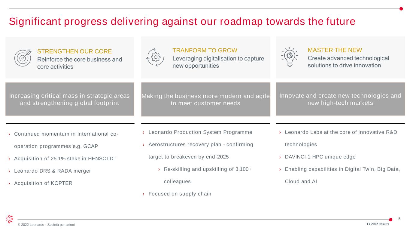 4 © 2022 Leonardo - Società per azioni A Stronger Leonardo: Successful Delivery of 2018-2022 Industrial Plan *€3 bn NH90 Qatar ** €1.4bn AW149 Poland Delivering results in line or exceeding yearly Guidance Emerging stronger commercially and financially with a more resilient and sustainable business model Successfully navigating a period of unprecedented global challenges ORDERS (€bn) CAGR 18-22: 3.4% 12,2 13,8 13,4 14,1 14,7 2018 2019 2020 2021 2022 REVENUES (€bn) EBITA (€mln) FOCF (€mln) CAGR 18-22: 4.7% CAGR 18-22: 2.1% (excl. Aerostructures: 4.9%) 15,1 14,1 13,8 14,3 17,3 2018 2019 2020 2021 2022* ** CAGR 18-22: 12.5% (excl. Aerostructures: 7.8%) FY 2022 Results 336 241 40 209 539 -283 -157 -329 -339 -296 2018 2019 2020 2021 2022Aerostructures 1.120 1.251 938 1,123 1,218 1,157 1,262 1,024 1,326 1,401 2018 2019 2020 2021 2022 Excluding Aerostructures