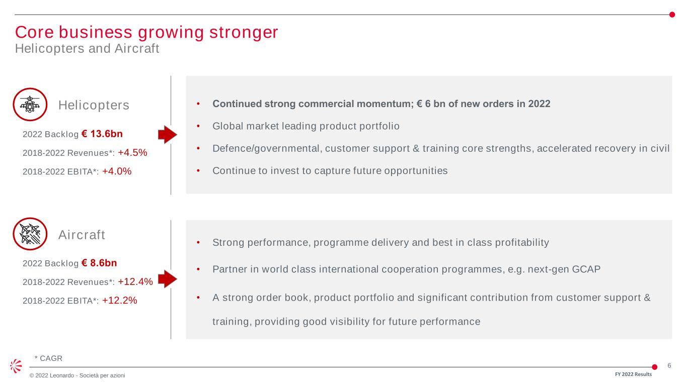 5 © 2022 Leonardo - Società per azioni STRENGTHEN OUR CORE Reinforce the core business and core activities Significant progress delivering against our roadmap towards the future TRANFORM TO GROW Leveraging digitalisation to capture new opportunities MASTER THE NEW Create advanced technological solutions to drive innovation › Continued momentum in International co- operation programmes e.g. GCAP › Acquisition of 25.1% stake in HENSOLDT › Leonardo DRS & RADA merger › Acquisition of KOPTER › Leonardo Production System Programme › Aerostructures recovery plan - confirming target to breakeven by end-2025 › Re-skilling and upskilling of 3,100+ colleagues › Focused on supply chain › Leonardo Labs at the core of innovative R&D technologies › DAVINCI-1 HPC unique edge › Enabling capabilities in Digital Twin, Big Data, Cloud and AI Increasing critical mass in strategic areas and strengthening global footprint Making the business more modern and agile to meet customer needs Innovate and create new technologies and new high-tech markets FY 2022 Results