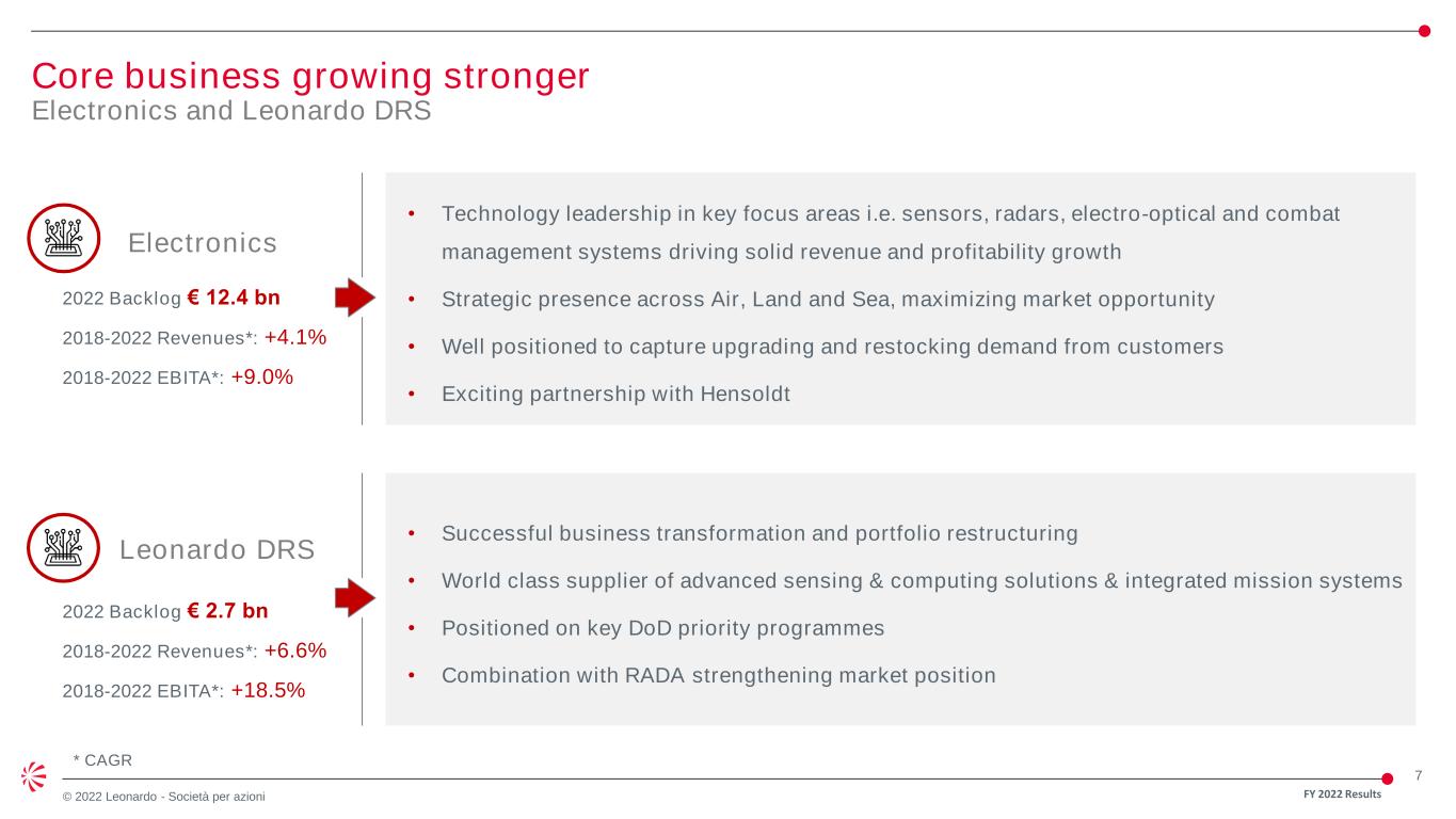 6 © 2022 Leonardo - Società per azioni Core business growing stronger Helicopters and Aircraft Helicopters Aircraft 2022 Backlog € 13.6bn 2018-2022 Revenues*: +4.5% 2018-2022 EBITA*: +4.0% 2022 Backlog € 8.6bn 2018-2022 Revenues*: +12.4% 2018-2022 EBITA*: +12.2% * CAGR • Strong performance, programme delivery and best in class profitability • Partner in world class international cooperation programmes, e.g. next-gen GCAP • A strong order book, product portfolio and significant contribution from customer support & training, providing good visibility for future performance • Continued strong commercial momentum; € 6 bn of new orders in 2022 • Global market leading product portfolio • Defence/governmental, customer support & training core strengths, accelerated recovery in civil • Continue to invest to capture future opportunities FY 2022 Results