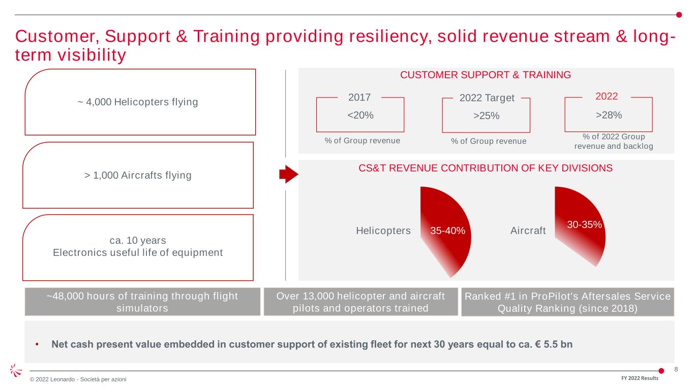 7 © 2022 Leonardo - Società per azioni • Technology leadership in key focus areas i.e. sensors, radars, electro-optical and combat management systems driving solid revenue and profitability growth • Strategic presence across Air, Land and Sea, maximizing market opportunity • Well positioned to capture upgrading and restocking demand from customers • Exciting partnership with Hensoldt Core business growing stronger Electronics and Leonardo DRS Electronics Leonardo DRS 2022 Backlog € 12.4 bn 2018-2022 Revenues*: +4.1% 2018-2022 EBITA*: +9.0% 2022 Backlog € 2.7 bn 2018-2022 Revenues*: +6.6% 2018-2022 EBITA*: +18.5% * CAGR • Successful business transformation and portfolio restructuring • World class supplier of advanced sensing & computing solutions & integrated mission systems • Positioned on key DoD priority programmes • Combination with RADA strengthening market position FY 2022 Results