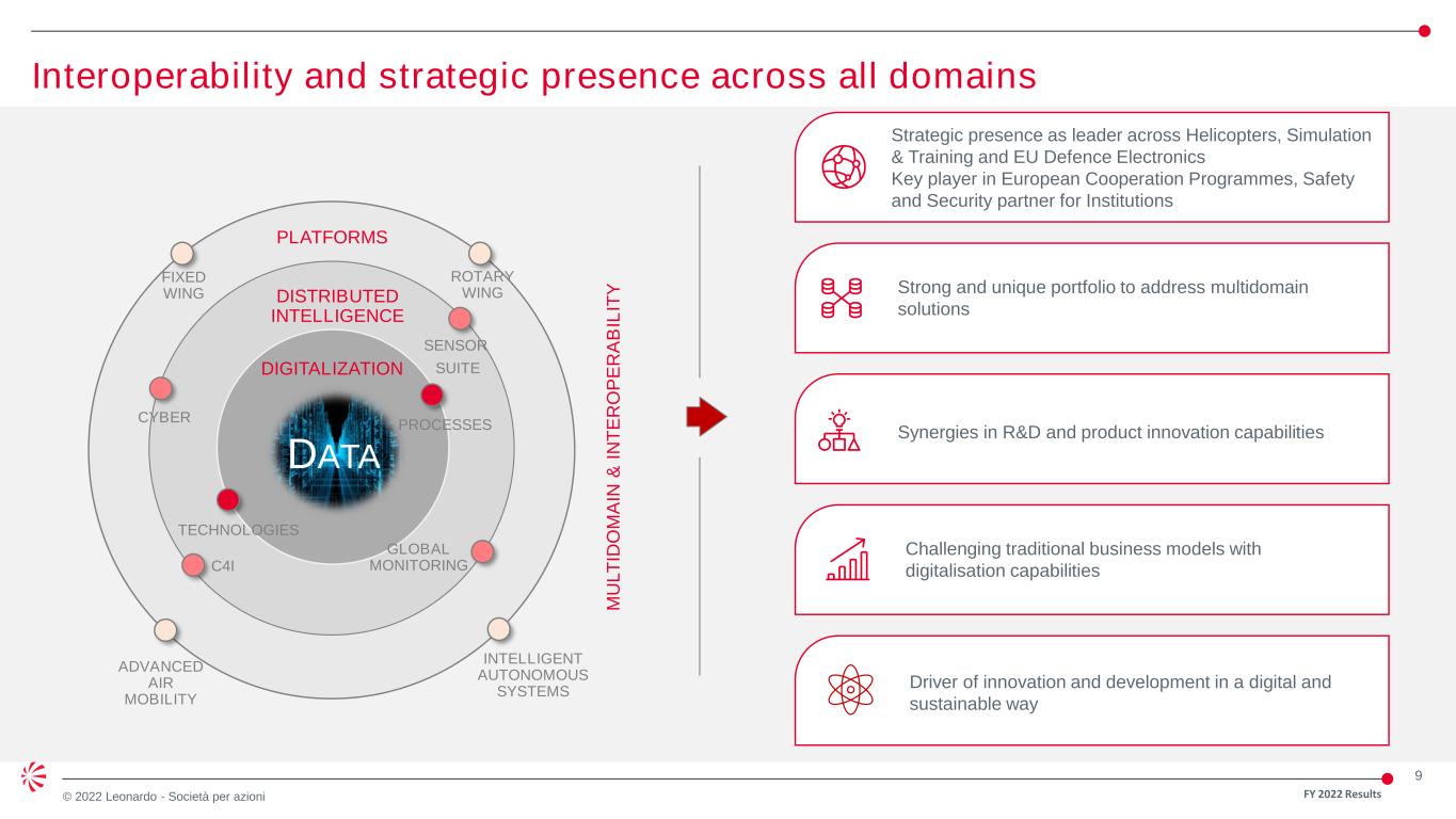 8 © 2022 Leonardo - Società per azioni Customer, Support & Training providing resiliency, solid revenue stream & long- term visibility ~ 4,000 Helicopters flying > 1,000 Aircrafts flying ca. 10 years Electronics useful life of equipment Helicopters • Net cash present value embedded in customer support of existing fleet for next 30 years equal to ca. € 5.5 bn Aircraft35-40% 30-35% CUSTOMER SUPPORT & TRAINING ~48,000 hours of training through flight simulators Over 13,000 helicopter and aircraft pilots and operators trained Ranked #1 in ProPilot's Aftersales Service Quality Ranking (since 2018) <20% % of Group revenue 2017 >28% % of 2022 Group revenue and backlog 2022 >25% % of Group revenue 2022 Target CS&T REVENUE CONTRIBUTION OF KEY DIVISIONS FY 2022 Results